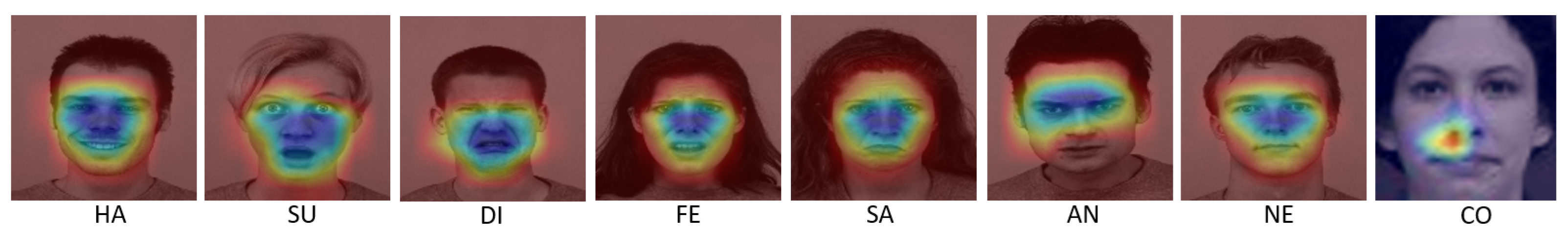 Table 6. The model primarily attends to the eyes, nose, cheeks, and lips, as well as subtle microexpressions located around the nose and below the eyes, as illustrated in