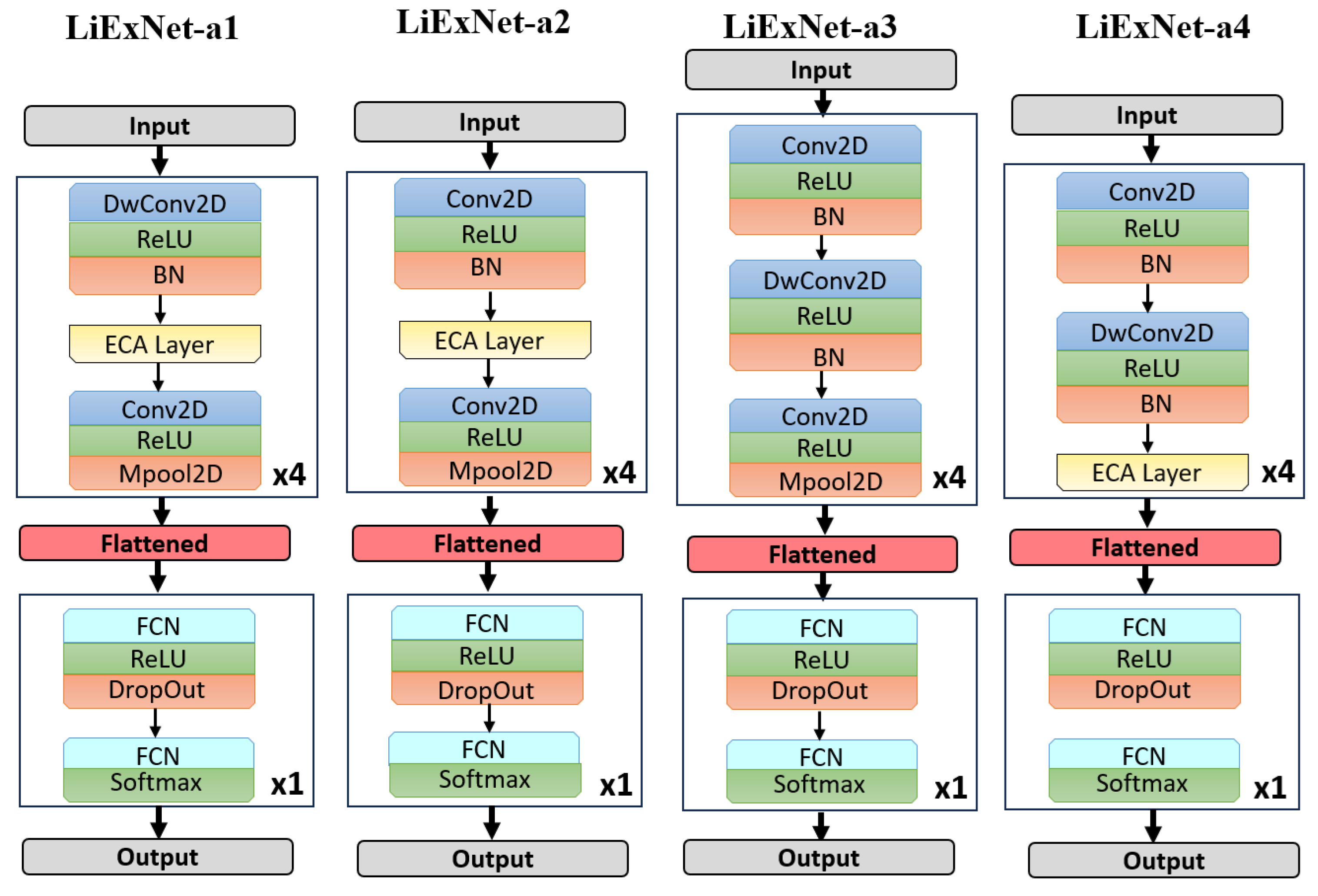 Figure 1 presents the overall architecture of LiExNet, organized into the following stages: input layer, feature extraction block, flattening layer, classification block, and output layer.