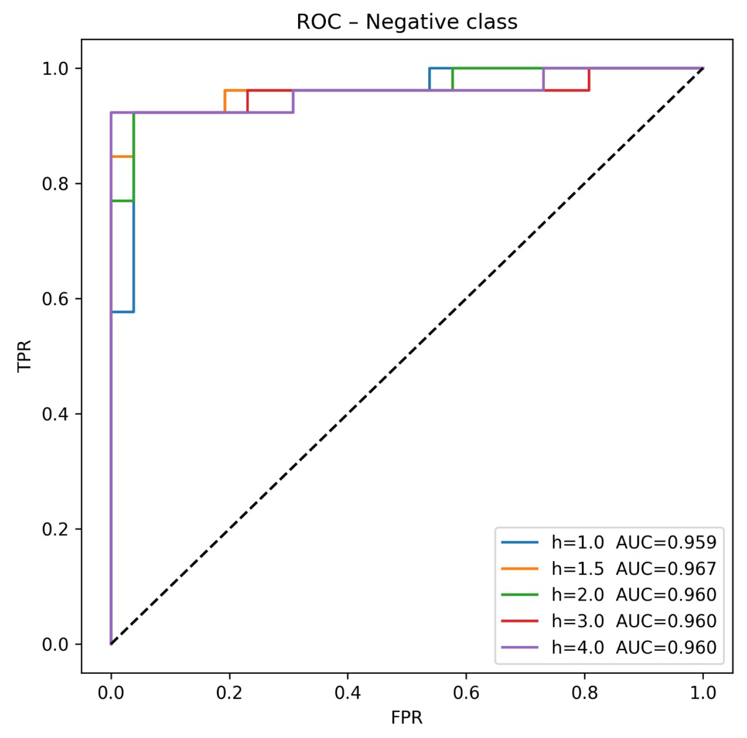 Based on these points, it can be observed that information about whether subjects work or not contributes to model performance when . Specifically, with , the model exhibits improved discrimination capability between classes, particularly for the negative class, across all possible thresholds. In contrast, yields the best classification accuracy. The weight of suggests a potential overemphasis on the working subjects. These findings indicate that including the weight factor improves inter-class separability, as prior knowledge of the affective state (habitual work-related stress or relaxed) helps extract more discriminative features from facial expressions and microexpressions, thereby enhancing emotion recognition.