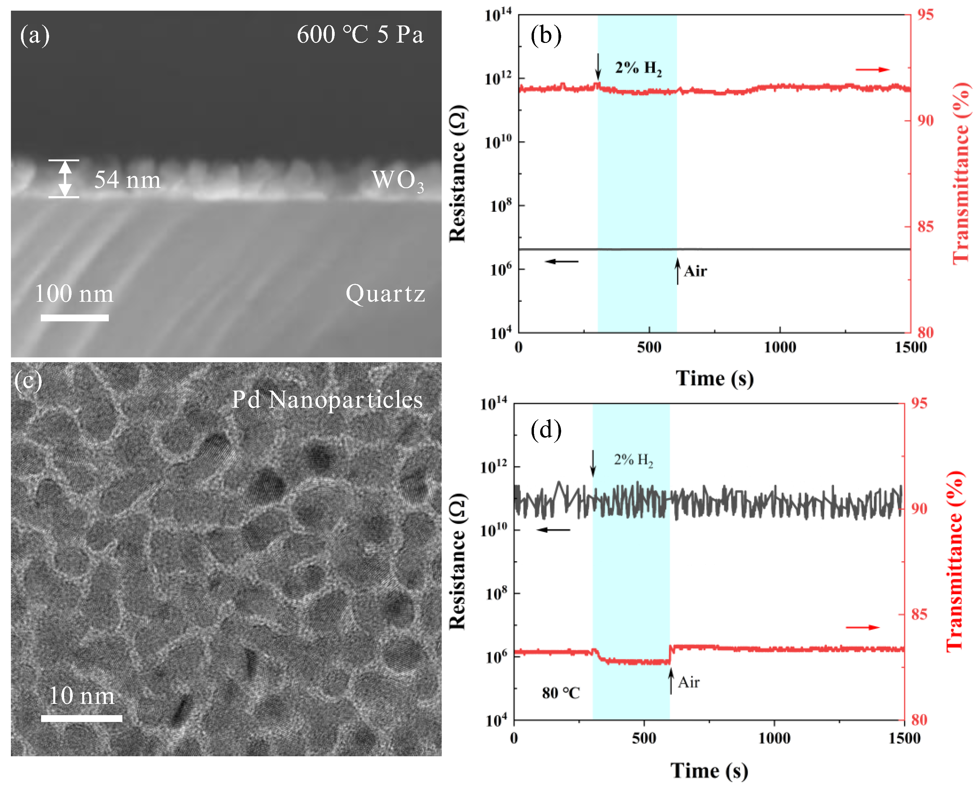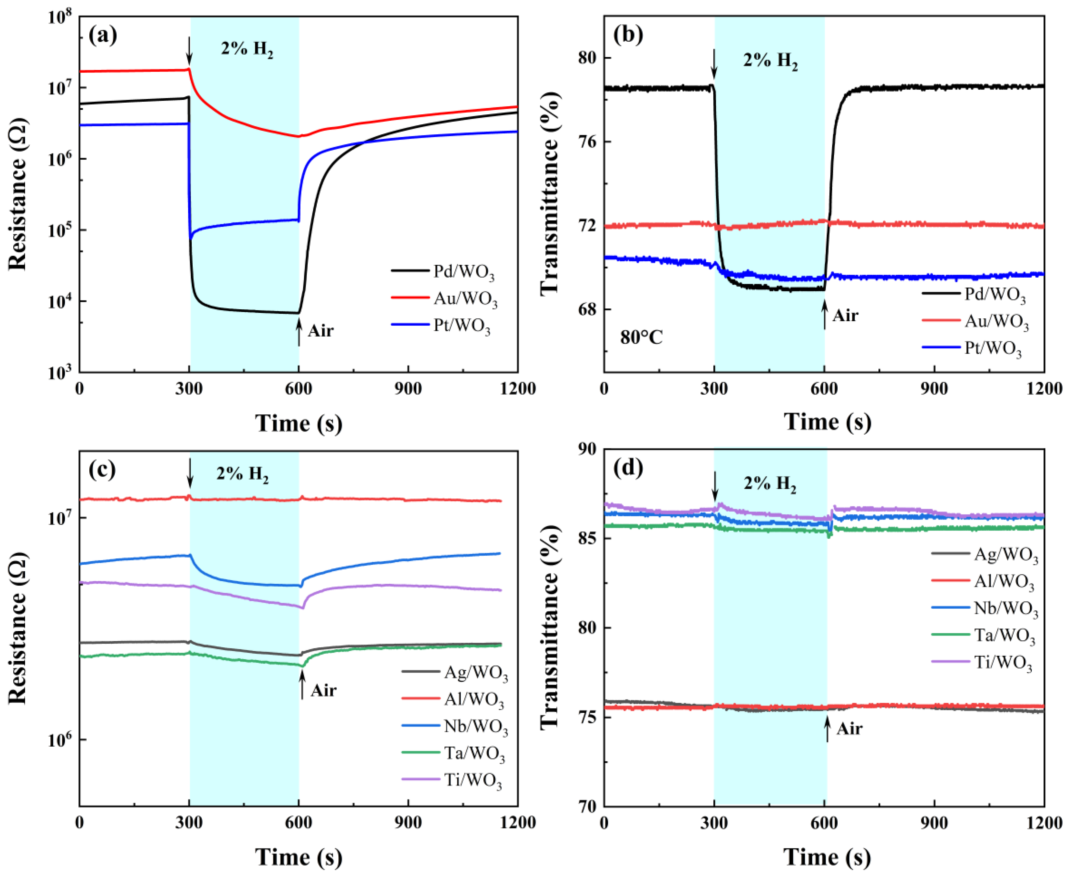 - Cho, S.H.; Suh, J.M.; Jeong, B.; Lee, T.H.; Choi, K.S.; Eom, T.H.; Choi, S.W.; Nam, G.B.; Kim, Y.J.; Jang, H.W. Substantially Accelerated Response and Recovery in Pd-Decorated WO3 Nanorods Gasochromic Hydrogen Sensor. Small 2024, 20, e2309744. [Google Scholar] [CrossRef]