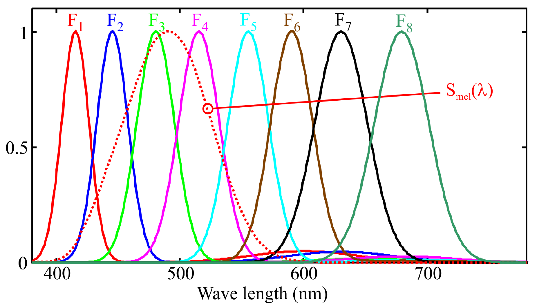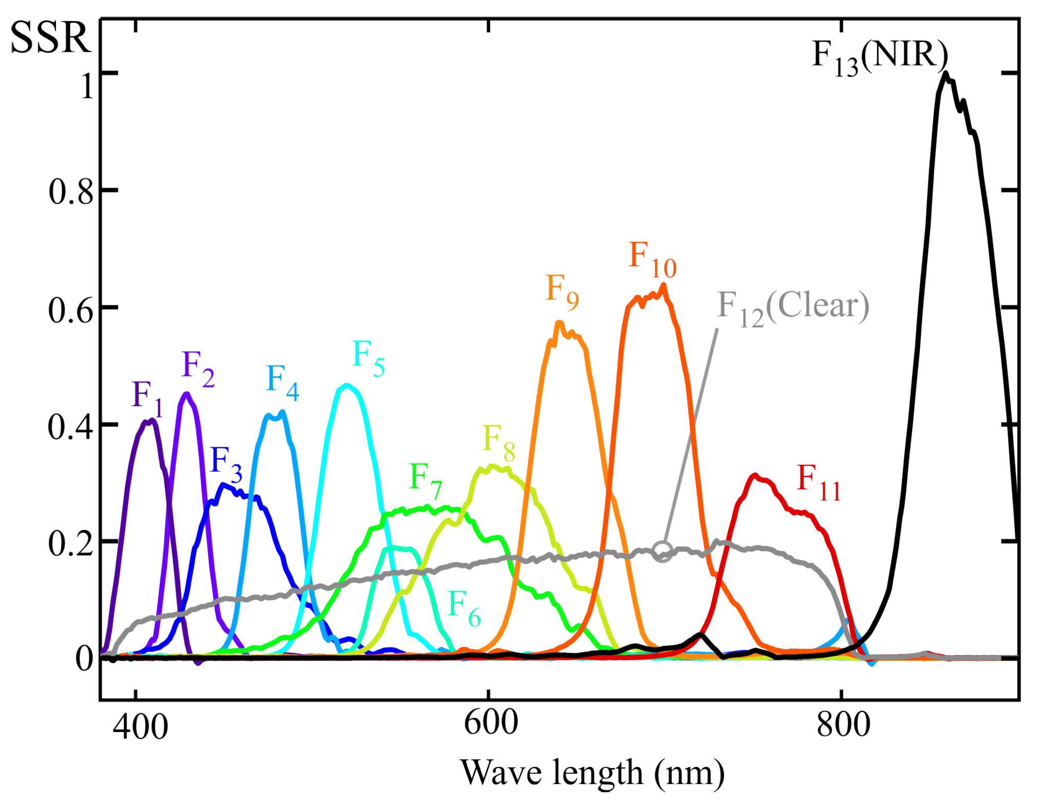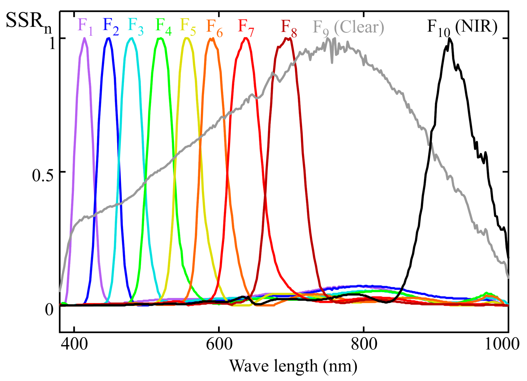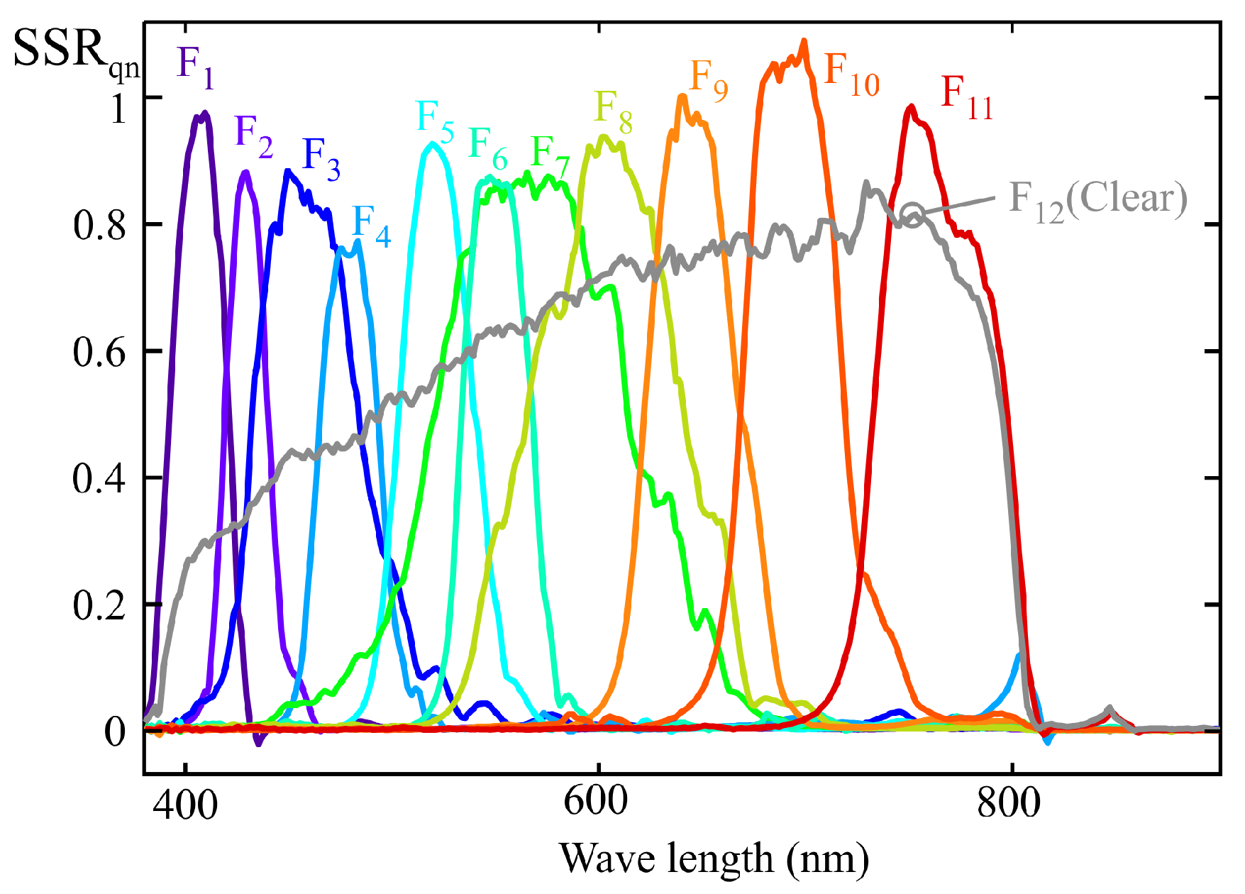 Figure 2 shows the normalized spectral response of a representative eight-channel sensor with characteristics comparable to those of certain commercially available models. Each channel, denoted as