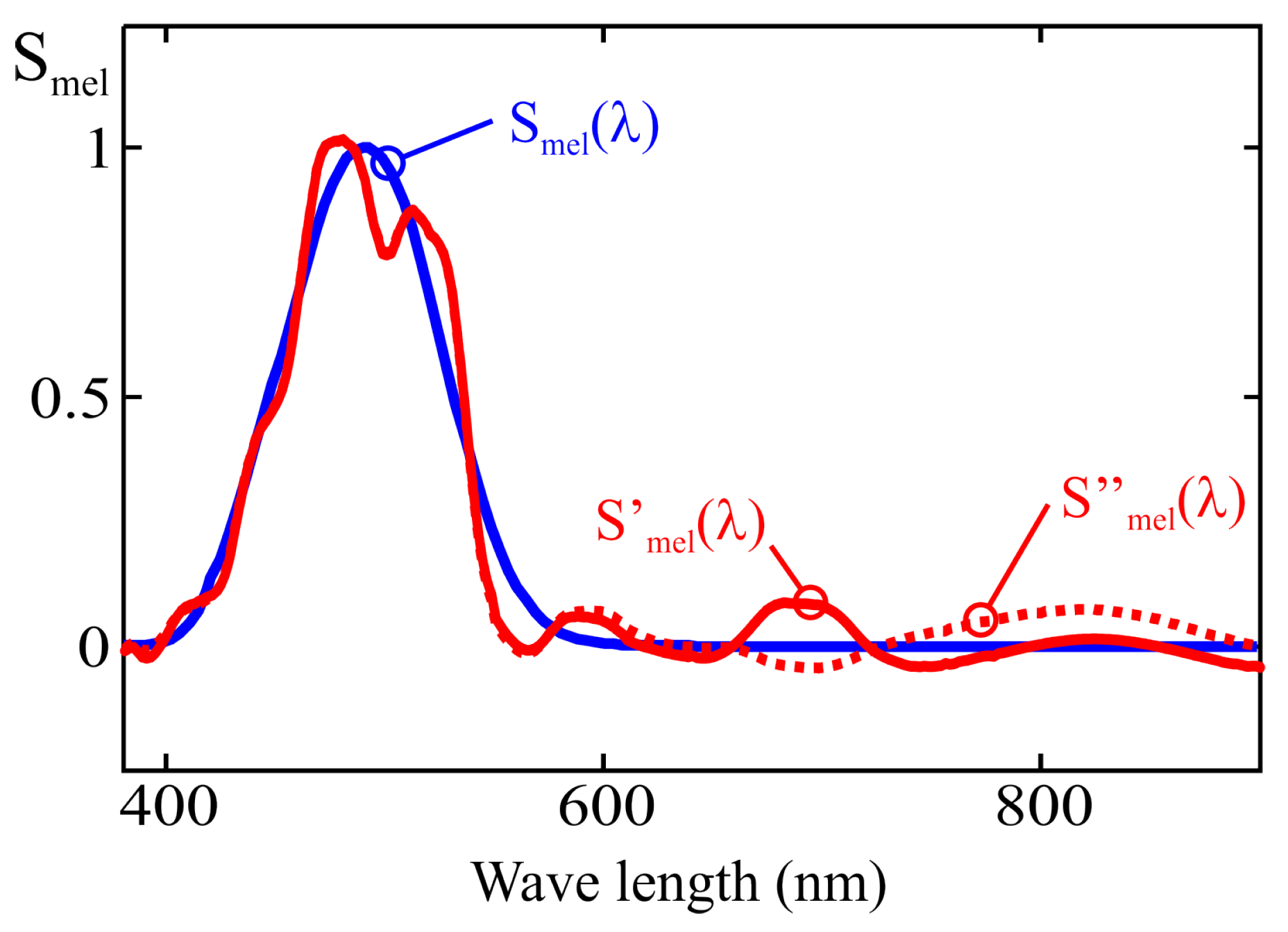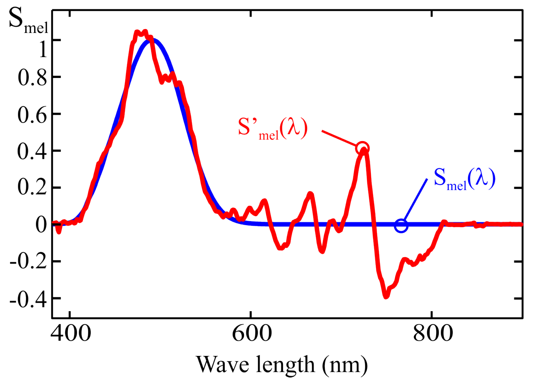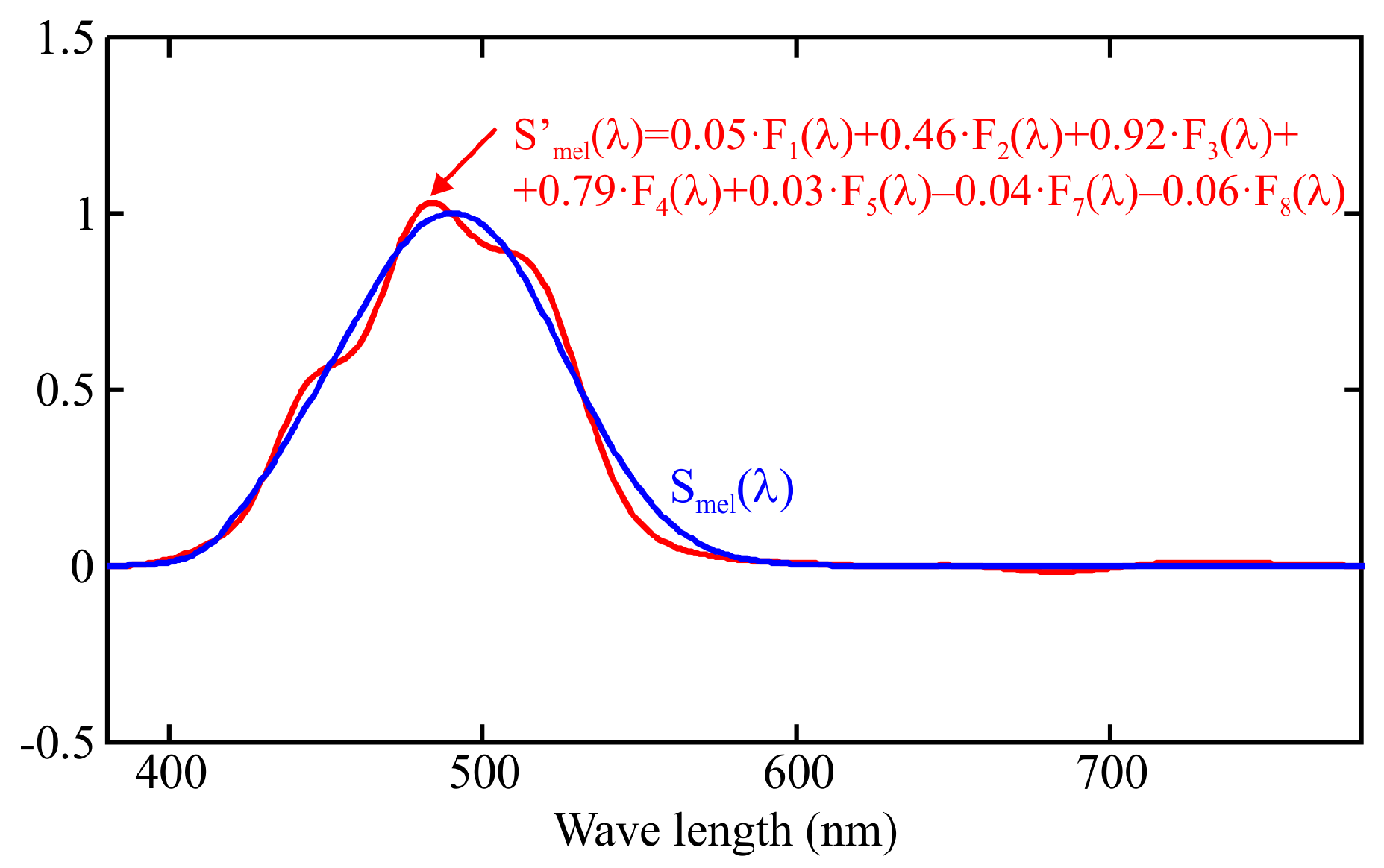 Based on the spectral response data obtained from these two sensors, the performance of the calibration method based on multivariable linear regression with a limited set of calibration illuminants was evaluated. The resulting equivalent spectral response was compared with the target melanopic sensitivity function , revealing that significant discrepancies may arise. These deviations can result in large errors when measuring m-EDI under light sources whose spectral power distributions are not well represented by linear combinations of the selected calibration illuminants. A detailed examination of the equivalent spectral responses showed that the largest discrepancies are associated with the presence of anomalous weighting coefficients. These are defined as coefficients with absolute values considerably greater than those of the main channels, which are the channels whose peak sensitivity lies close to the maximum of the target melanopic function.