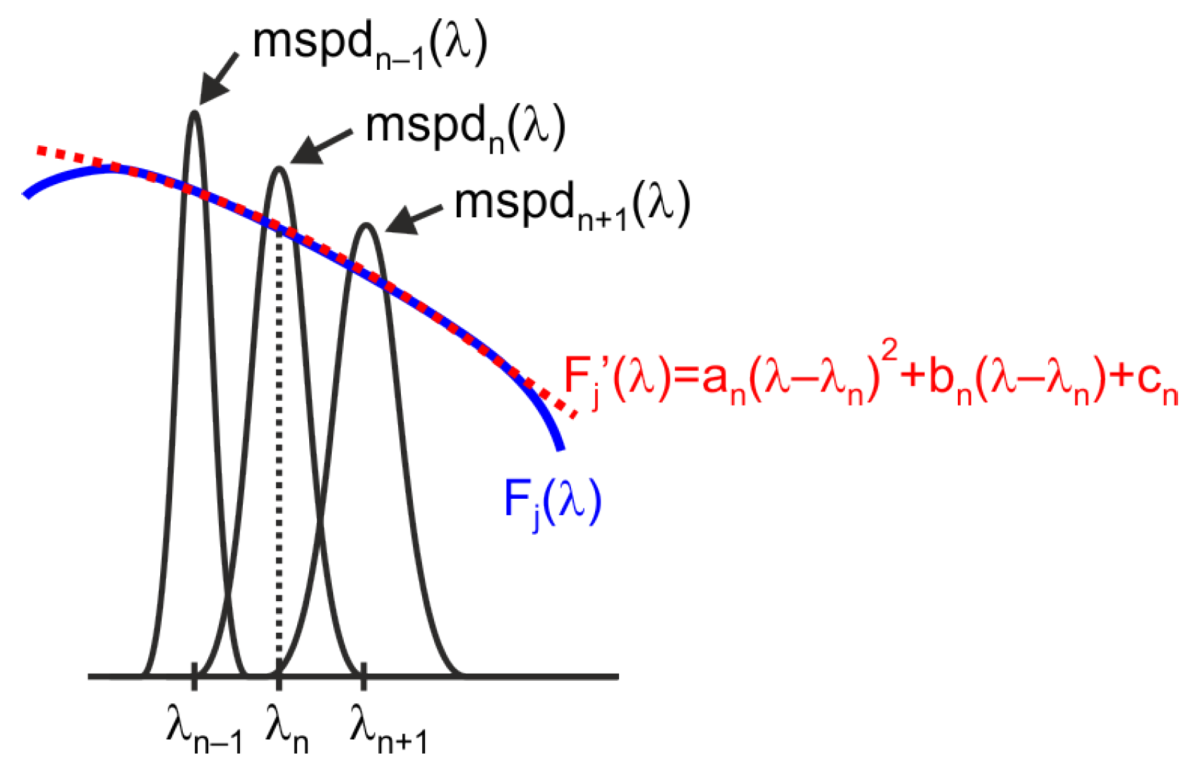 Figure 6 illustrates the procedure used to compensate for spectral shifts in the quasi-monochromatic signals employed for characterization. This procedure is based on approximating the actual response of the sensor’s channel under characterization,