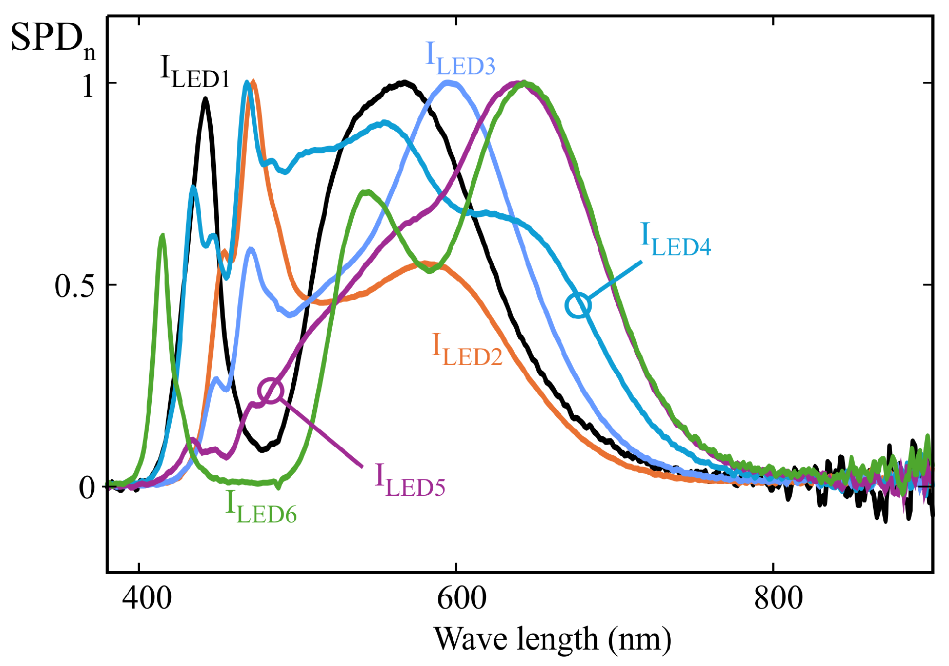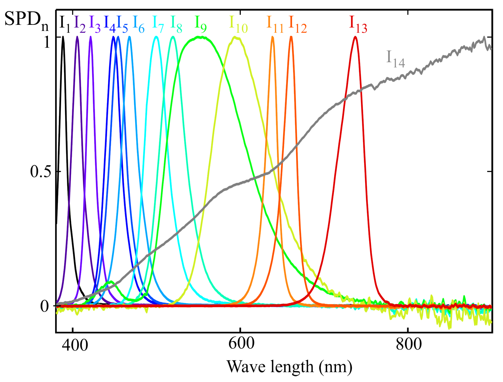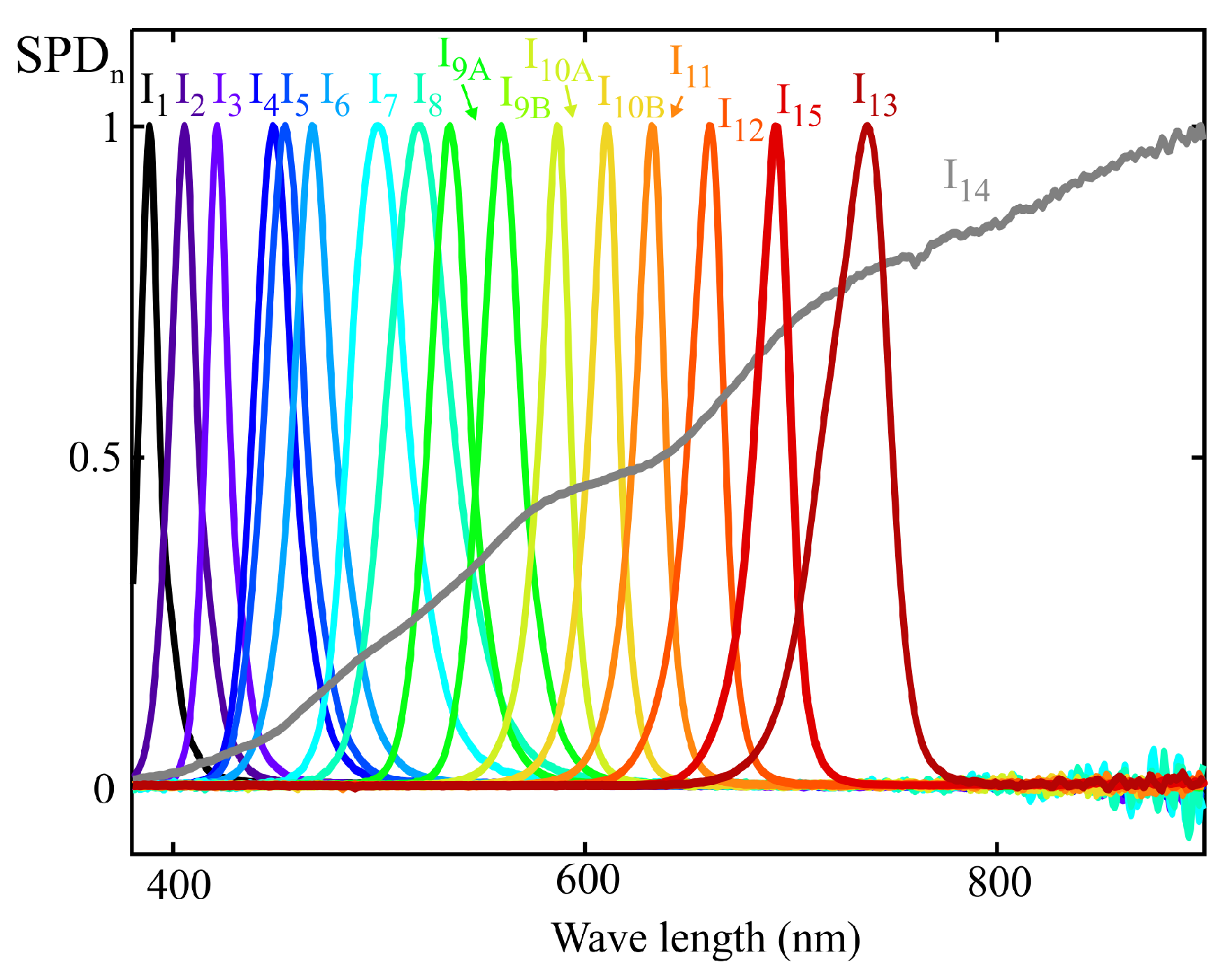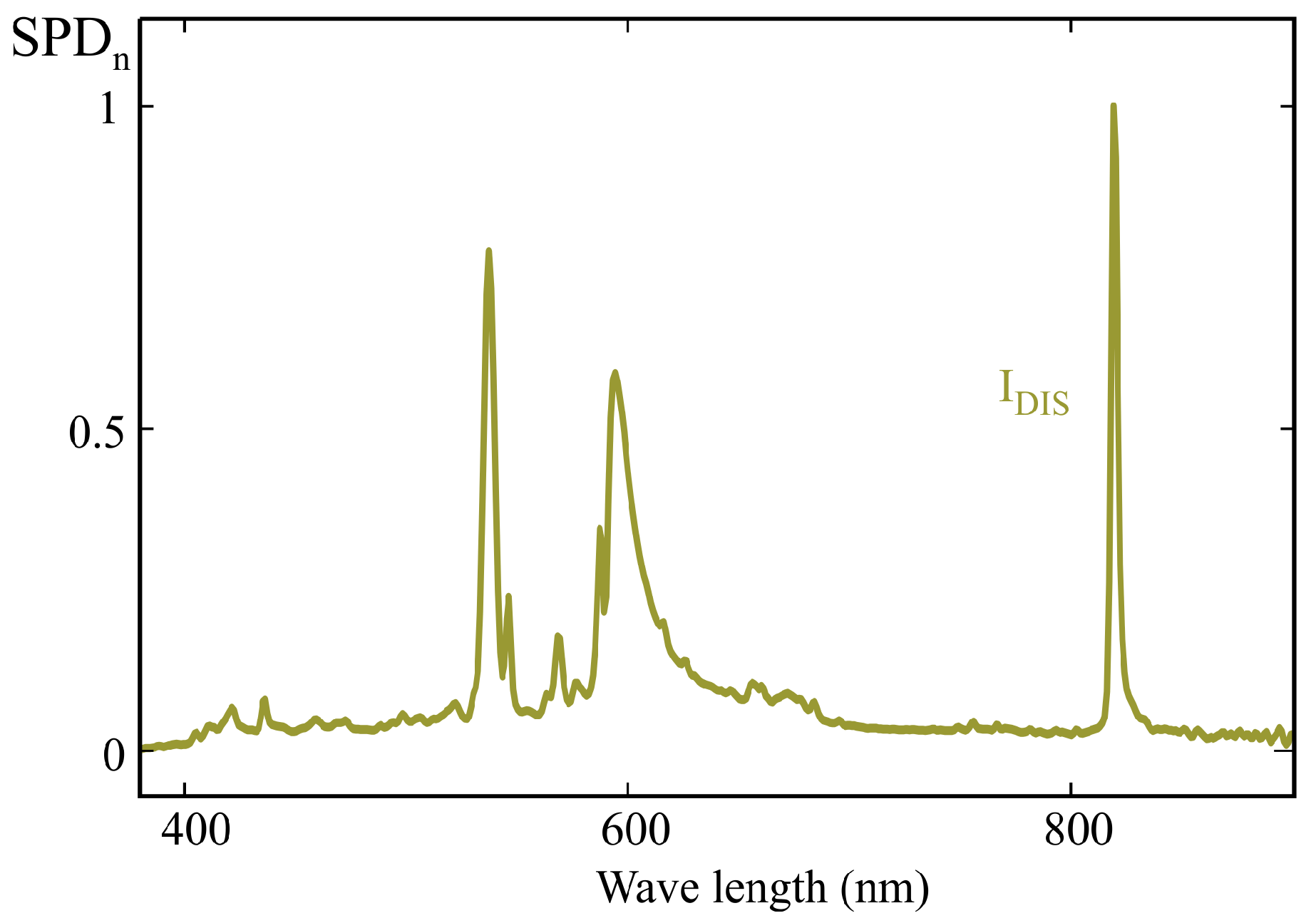 Furthermore, although discharge lamps are currently being replaced by high-efficiency LEDs in virtually all applications, one such lamp was included among the test illuminants due to its strongly discontinuous spectrum, which makes it particularly sensitive to response deviations arising from the use of the MLR method, as discussed later in this section. The normalized spectrum of this lamp is shown in