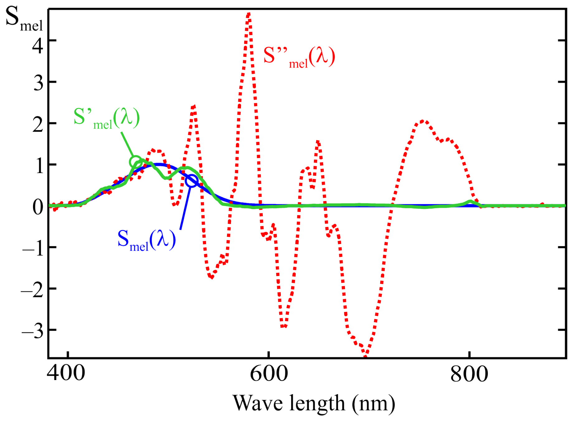is the normalized melanopic sensitivity function, which peaks at 490 nm in the cyan region of the spectrum. The m-EDI value is equal to 0.754 times