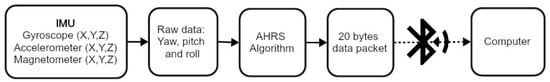 Six Inertial Measurement Units WT901BLECL (WitMotion, Shenzhen, China) equipped with BLE 5.0 were employed, offering a sampling frequency range of 0.1–200 Hz and a battery life of up to 10 h. Each unit integrates an accelerometer, gyroscope, and magnetometer, allowing for the estimation of attitude (the angular deviation between an object axis and the Earth’s horizon) and orientation through Madgwick’s Attitude and Heading Reference System (AHRS) algorithm [], as illustrated in Figure 1.