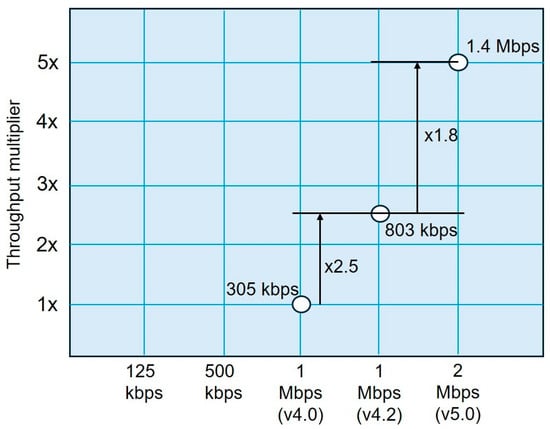 As shown in Figure 2, Bluetooth 4.2 enabled significant increases in net data throughput, with approximately 700 kbps of this traffic available for practical applications. These improvements were achieved by increasing the maximum packet size, a feature also included in Bluetooth 5.0, which, by doubling the over-the-air transfer rate, achieves a net throughput of around 1.4 Mbps.