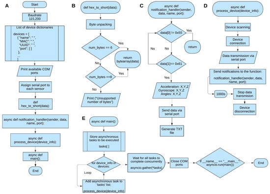 Flowchart of the asynchronous Python script used for multi-IMU BLE communication. (A) outlines the programming flow of the main execution; (B) presents the flow of the Data Unpacking function; (C) describes the Asynchronous Notification Handler, which manages sensor notifications concurrently; (D) details the Sensor Connection function executed asynchronously; and (E) shows the asynchronous “main” function that orchestrates the overall process.