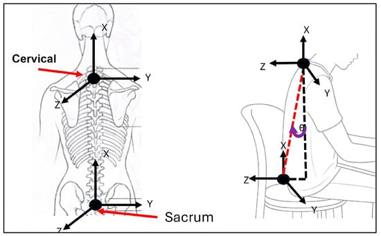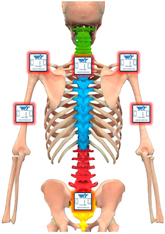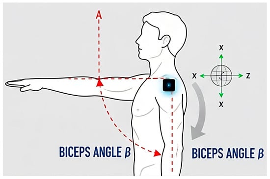 Moreover, some authors have noted that no studies have specifically investigated the importance of IMU sensor placement in upper-limb motion measurements []. Nevertheless, recommended sensor locations include the dorsal side at the distal end of the forearm, the upper arm, the lateral aspect of the upper arm, the scapula (cranially, along the spine), thorax, and trunk [,,].