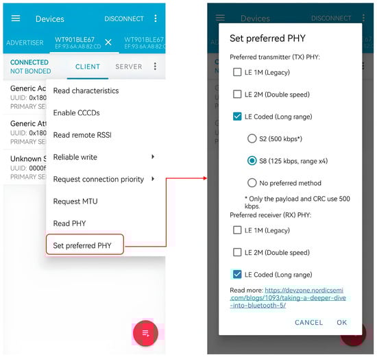 The IMU is equipped with the nRF52832 chip (Nordic Semiconductor, Trondheim, Norway), operating over BLE 5.0 and supporting transmission rates of up to 2 Mbps, with a net throughput of roughly 1.4 Mbps (see Figure 2). Extended range modes of 500 kbps and 125 kbps for increased coverage (×4) [,].