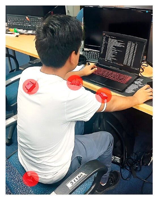 Six sensors were positioned at sites near the upper limb, as illustrated in Figure 8. The placement of IMUs is not standardized, but it has demonstrated reliable performance in previous upper-limb evaluations. As described by the authors in [], IMUs were placed on the left and right arms (LA, RA), left and right shoulders (LS, RS), cervical (C), and sacral (S) regions. These positions were selected to capture the primary kinematic segments involved in upper-limb posture evaluation—arm elevation, abduction, flexion, and rotation—relative to the trunk, consistent with the requirements of the RULA method and previous ergonomic studies.