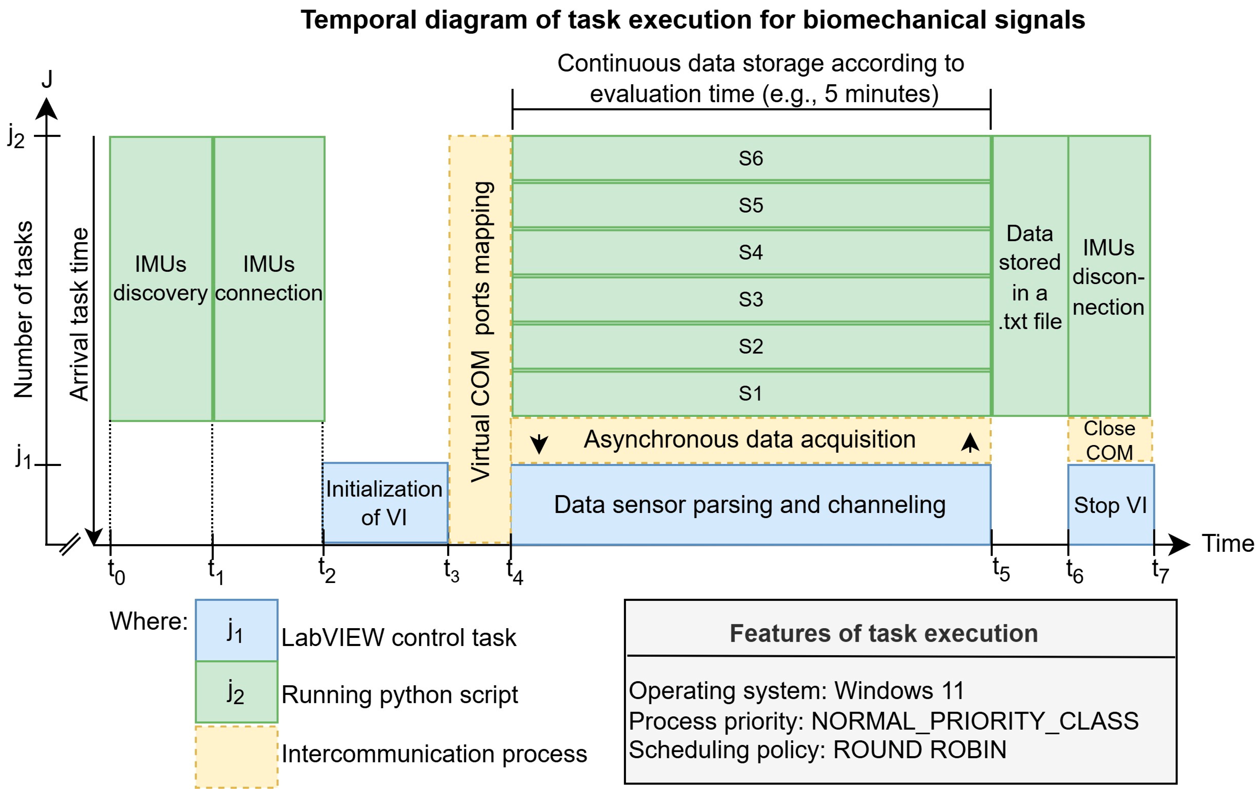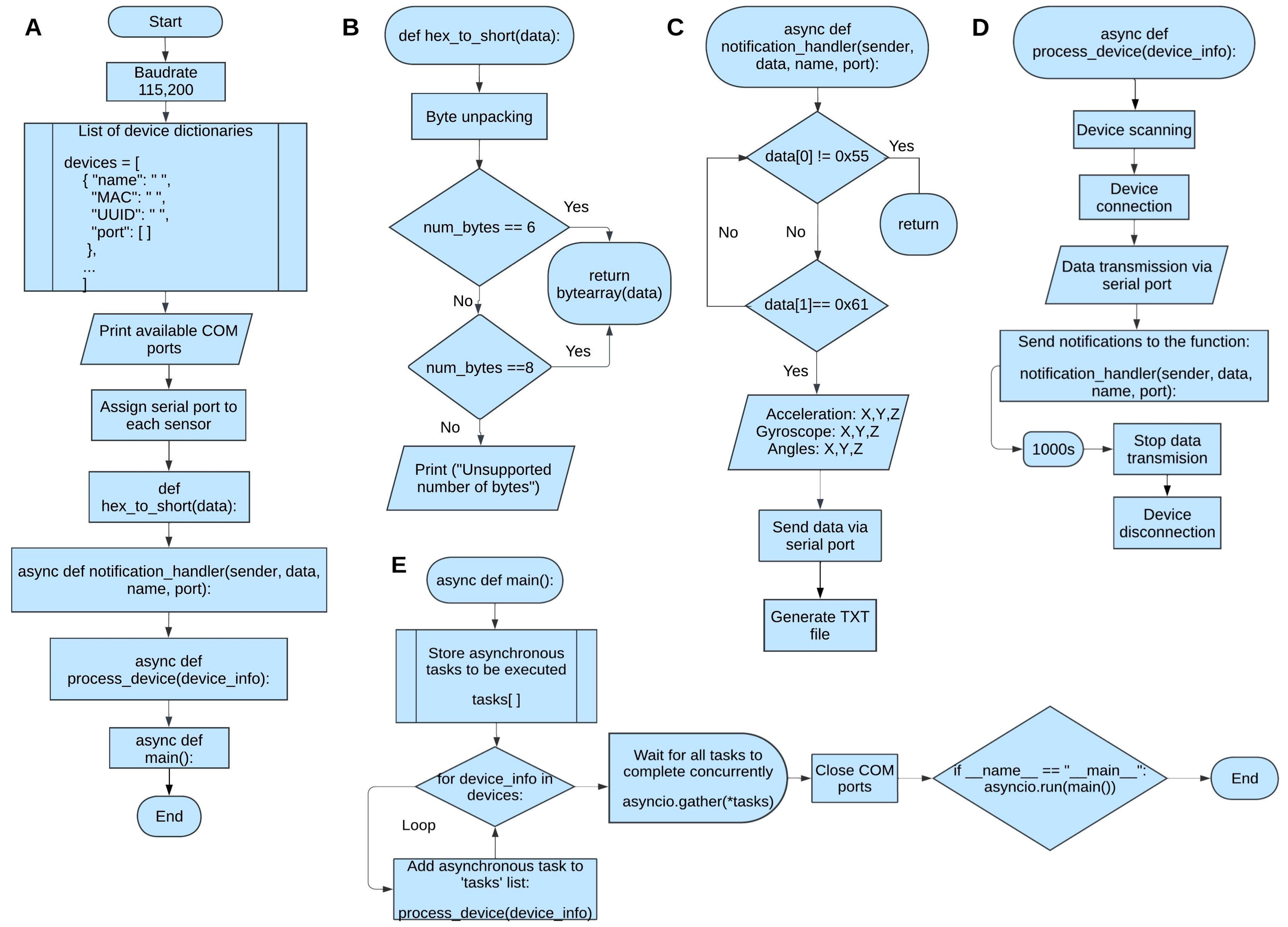 - Main Execution: This part of the diagram involves importing the necessary libraries, configuring the data transmission rate, and creating a list of device dictionaries for connection. The Communication (COM) ports are initialized and assigned to distinct sensors, ensuring proper execution of subsequent functions.