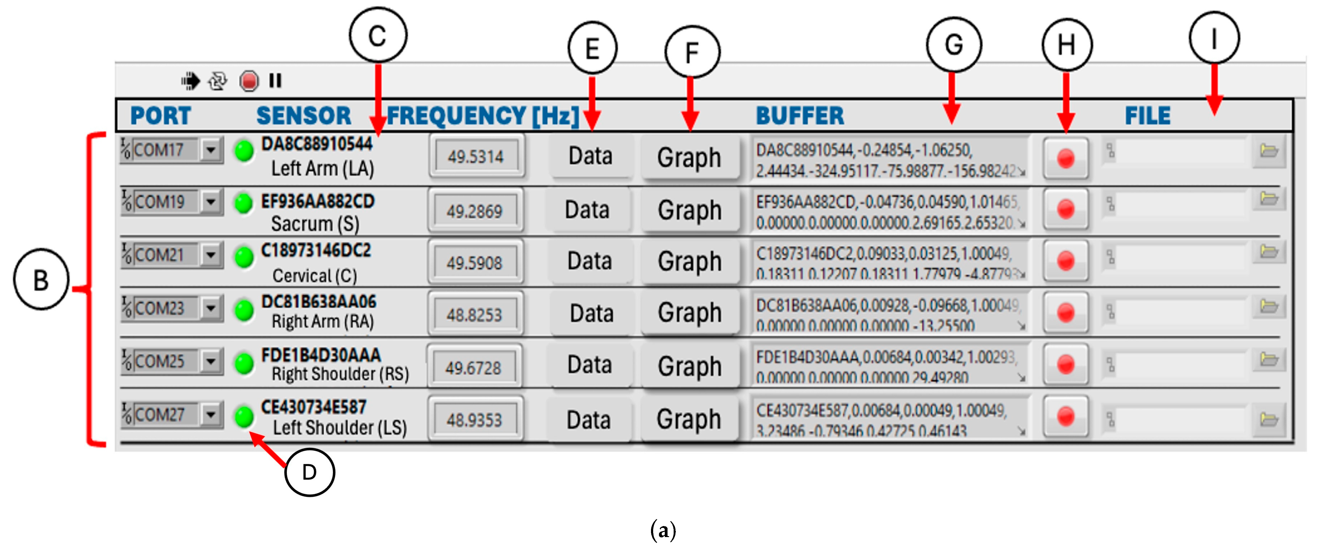 - Data Storage Button: Initiates independent storage of signal data from each sensor in a text file. The file captures the three variables from each IMU, along with their respective components (X, Y, Z), as depicted in Figure 7, and serves as the dataset used for subsequent post-processing.