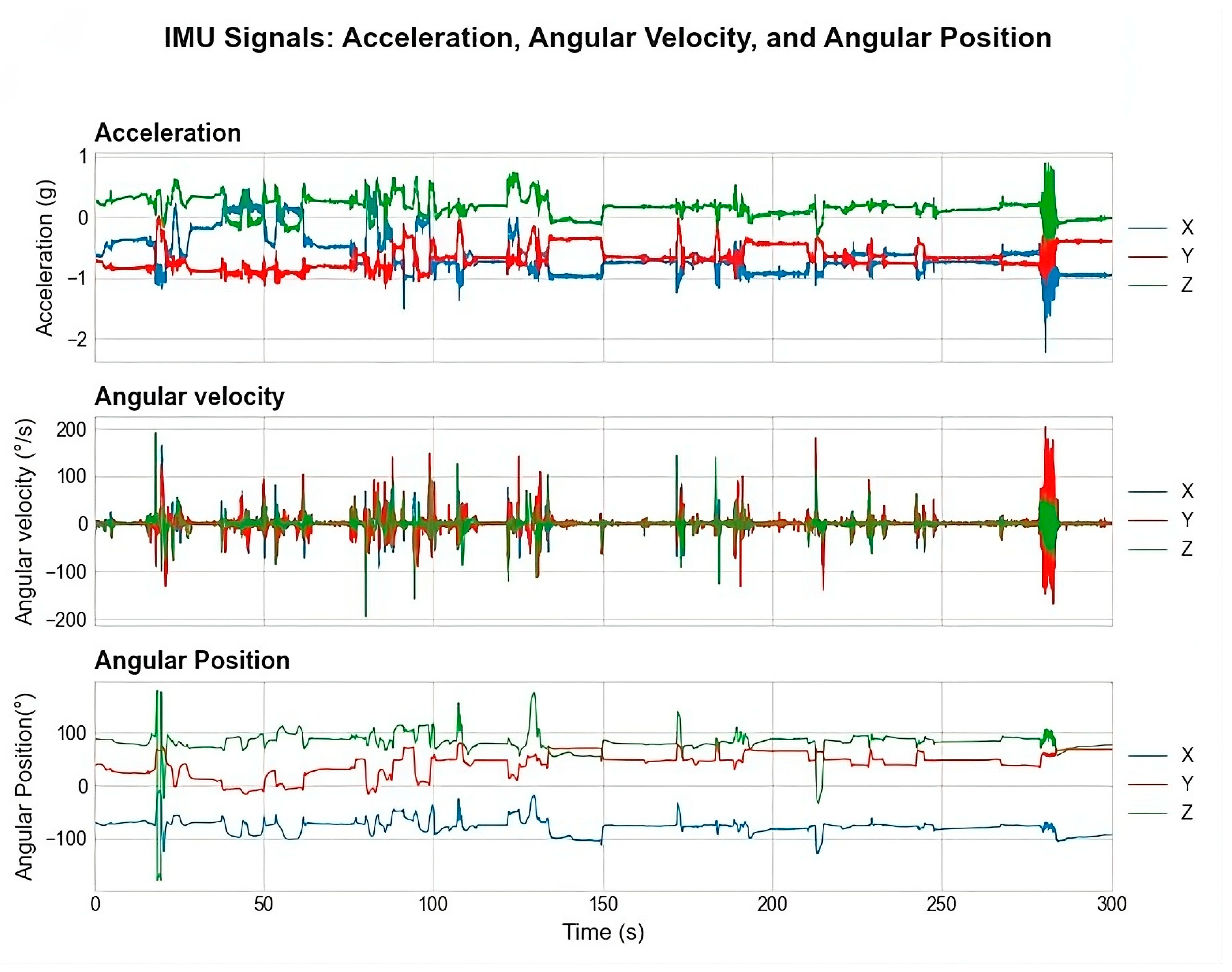 - Sensor signals were saved in text files, capturing acceleration (X, Y, Z), angular velocity (X, Y, Z), and positional angle (X, Y, Z) data.