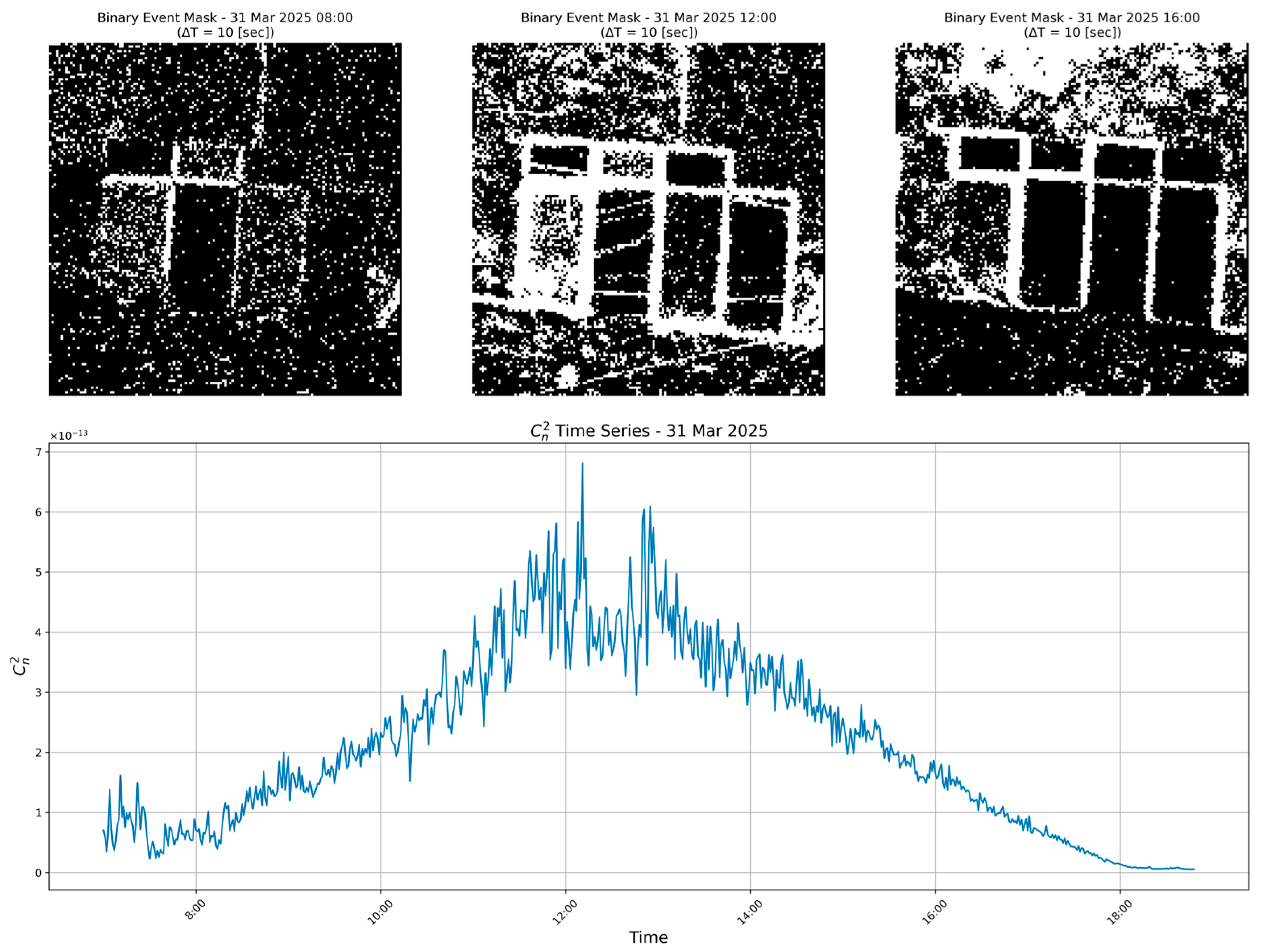 All sensors operated continuously 24/7 throughout the one-week experimental campaign. Data recording began on 27 March 2025 at 12:55 and ended on 3 April 2025 at 14:10 (local time). The scintillometer logged a measurement every 10 s during this entire period. The CMOS camera produced a 50 s high-speed video each minute (as described above), and the event camera simultaneously recorded a continuous stream of events. All devices, including the scintillometer, CMOS camera, and event camera were configured to use the same absolute system clock. This ensured that timestamps across all sensors were directly comparable, allowing each 10-s scintillometer interval to be precisely matched to the corresponding segment of the event stream and to overlapping CMOS video frames without temporal offset or interpolation. For the purposes of analysis, we focus on the daylight hours (07:00–19:00 local time each day) when the target was clearly visible. During these daytime periods, conditions were seasonally warm at Yavne, with air temperatures ranging from 24 to 34 °C, providing a broad span of convective turbulence strengths over the week. This yielded roughly 80 hours of usable multimodal recordings under varying turbulence conditions. All nighttime data (when the target contrast was insufficient for reliable event or image analysis) were set aside. The synchronized dataset from the three sensors (scintillometer, CMOS, and event camera) provides a rich record of turbulence effects over a range of conditions during the experiment.