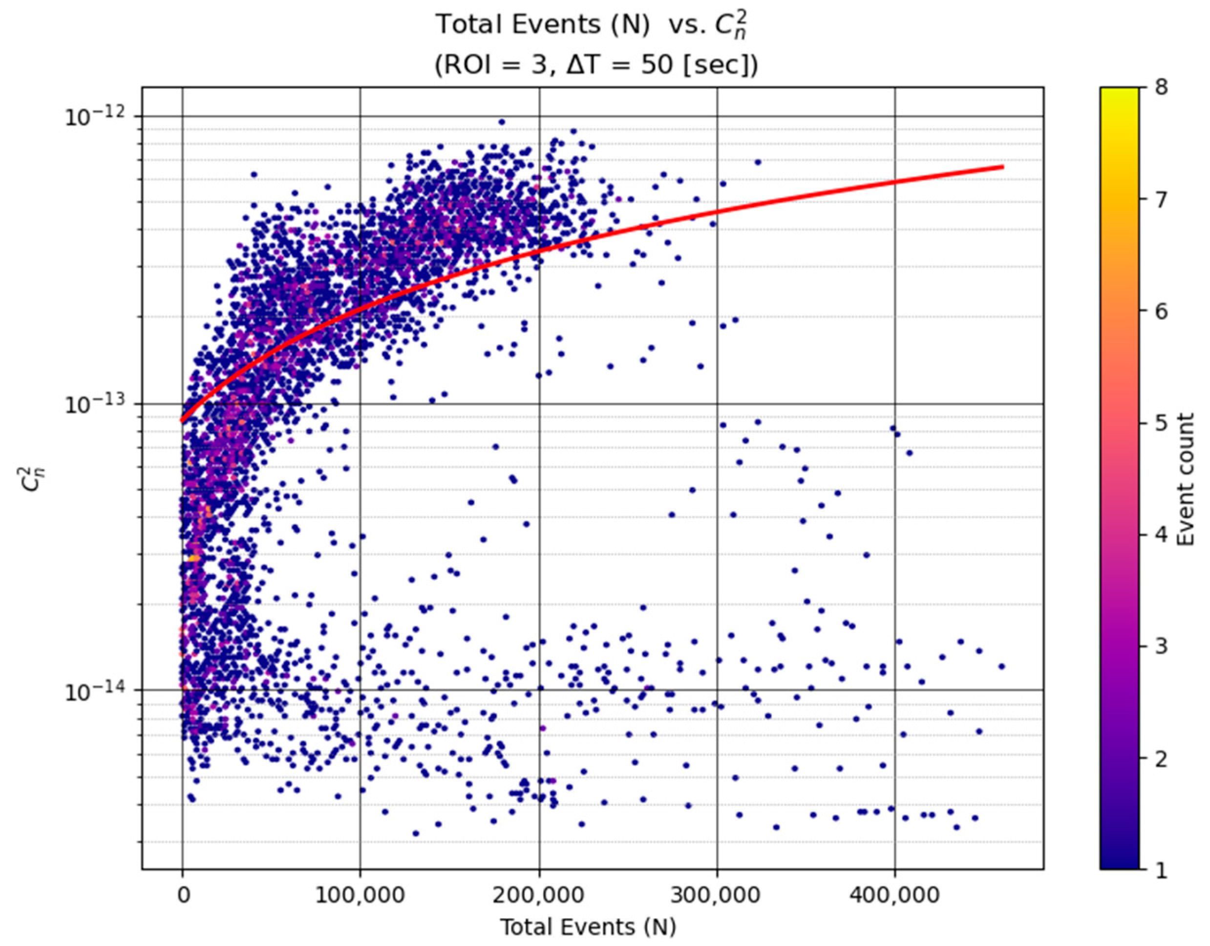 Visualizes this relationship by plotting total event count against the corresponding scintillometer-measured for ROI 3 at s, with a fitted regression curve overlaid. At very low turbulence levels, the event rate approaches the sensor’s noise floor, producing a cluster of low-activity points near the bottom of the plot. This behavior is expected in the weak-turbulence regime, where optical distortions fall below the event camera’s sensitivity. These points do not adversely affect the regression models because the learner correctly captures the nonlinear feature–response curve, and MSLE weighting prevents the low-turbulence samples from dominating the loss; furthermore, the associated absolute errors are inherently small in this regime.