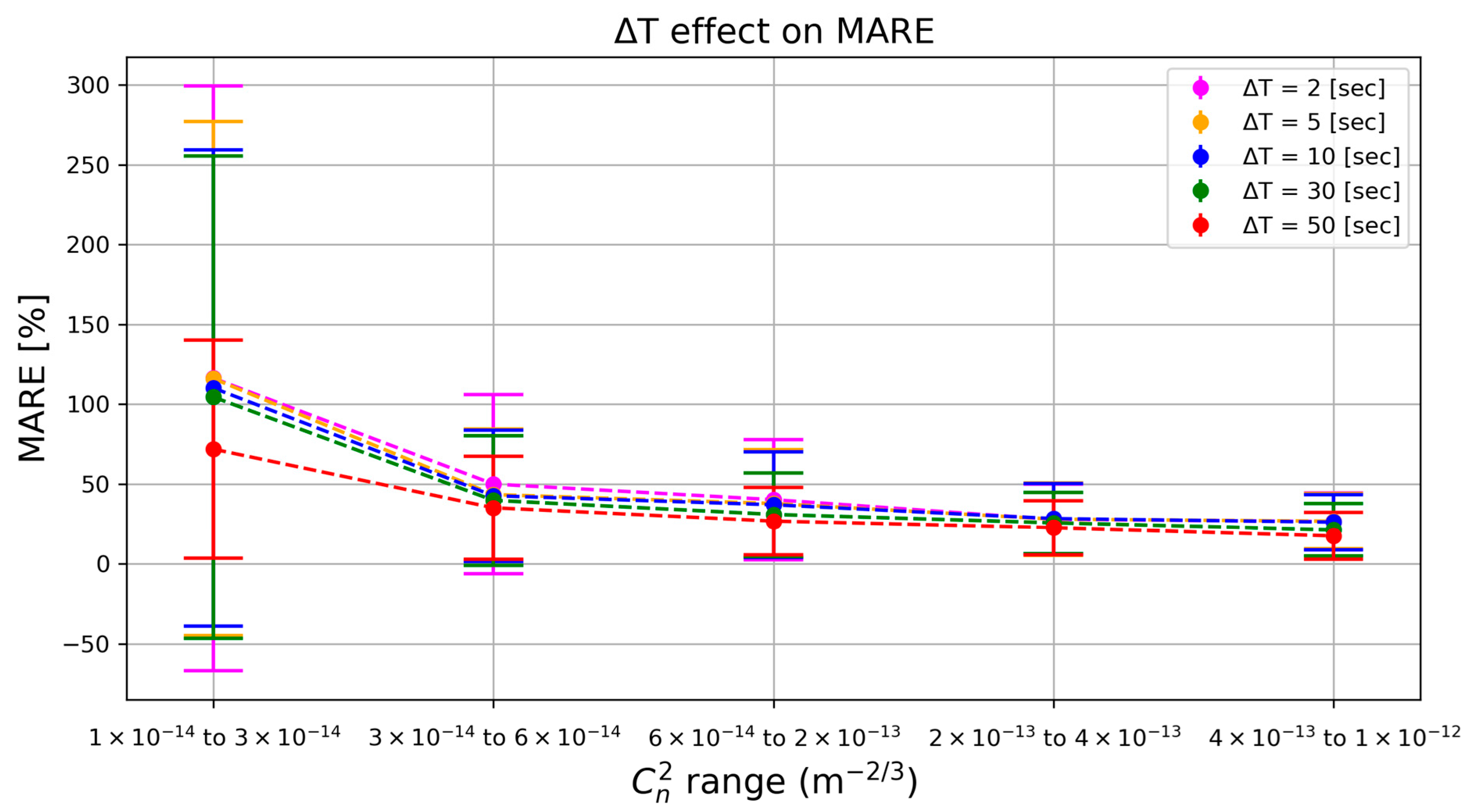 In addition to overall MARE, we performed a stratified error analysis by dividing the turbulence strength into five logarithmic ranges (levels of severity) and computing the error within each range. The ranges (in units of ) were defined as: