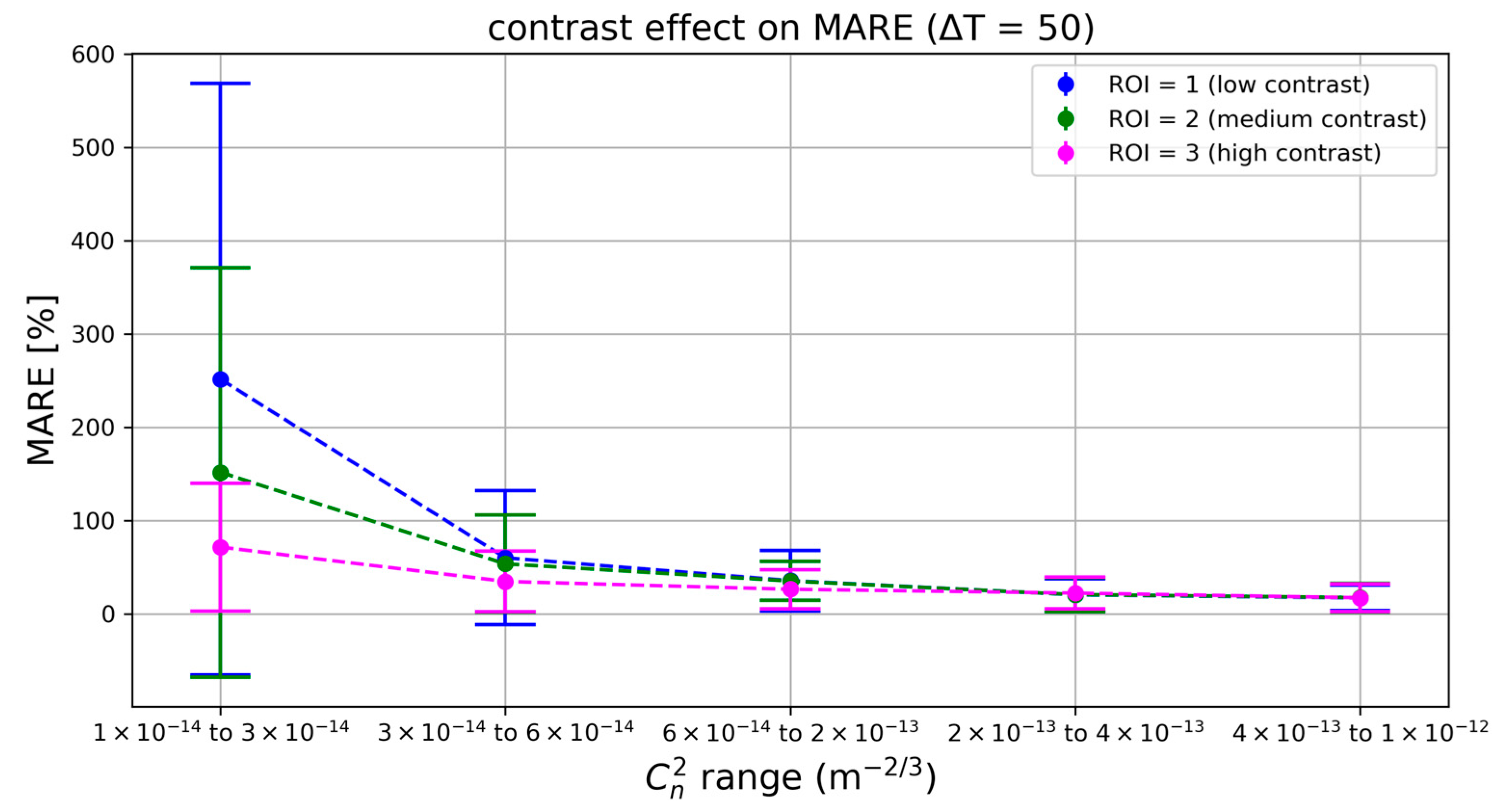 Finally, we analyzed the impact of scene contrast on the estimation accuracy. Different regions of interest were tested corresponding to varying inherent contrast in the imagery: ROI1 (low-contrast region), ROI2 (medium contrast), and ROI3 (high contrast). For this analysis, the integration time was fixed at ∆T = 50 s to isolate the effect of contrast.