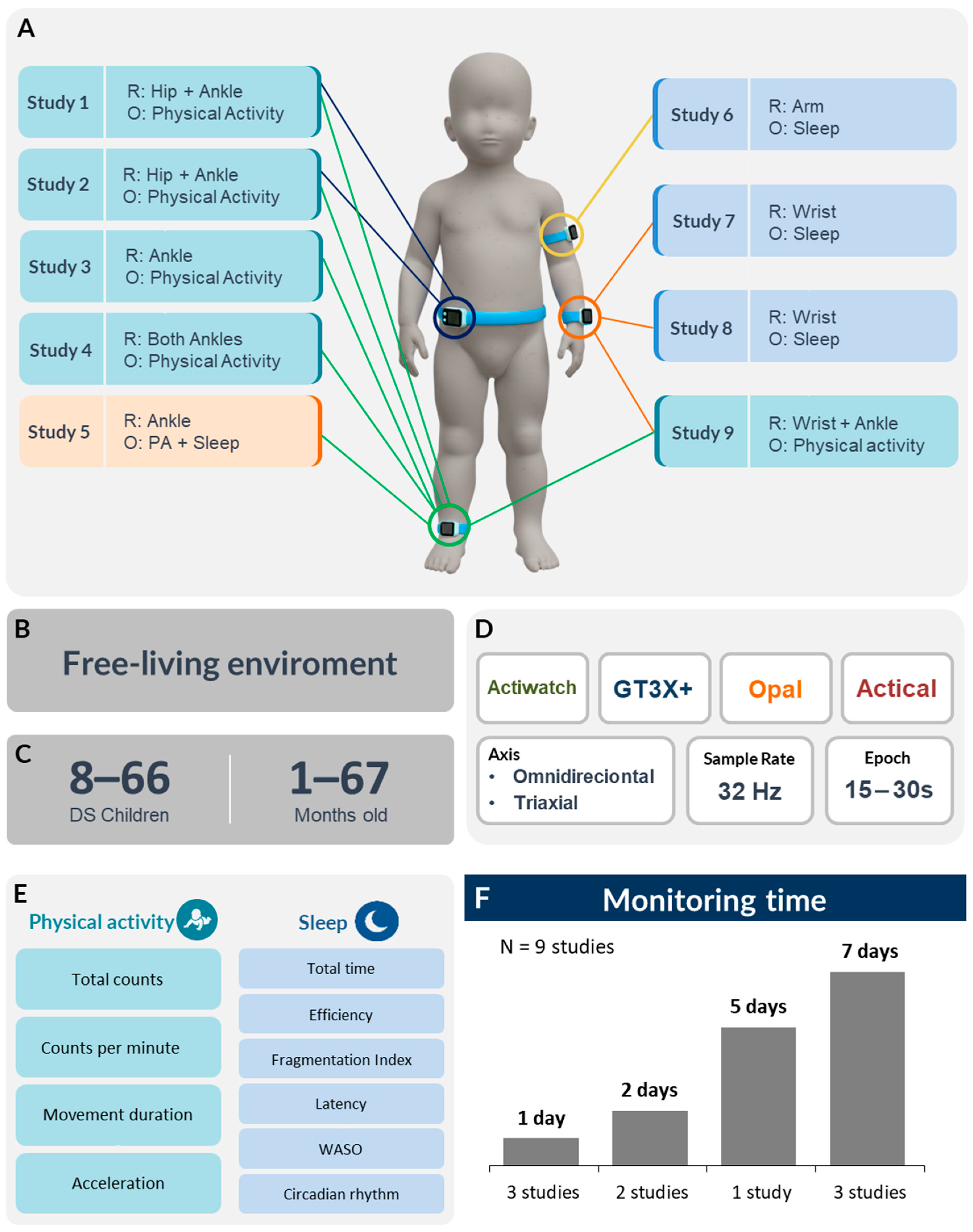 | Ketcheson, 2017 [40] | Actigraph/ GT3X+ | 15 s | 2 | Wrist/Ankle | 7 days | CPM (counts·min−1): Ankle: 1–2 mo—DS: 201.38; TD: 188.68 3–4 mo—DS: 248.28; TD: 322.01 5–6 mo—DS: 435.86; TD: 319.50 7–8 mo—DS: 433.10; TD: 397.48 9–10 mo—DS: 361.38; TD: 472.96 11–12 mo—DS: 433.10; TD: 460.38 Wrist: 1–2 mo—DS: 406.69; TD: 353.89 3–4 mo—DS: 409.36; TD: 456.07 5–6 mo—DS: 535.11; TD: 396.26 7–8 mo—DS: 481.60; TD: 633.02 9–10 mo—DS: 599.33; TD: 677.88 11–12 mo—DS: 470.90; TD: 705.30 Overall means (1–12 mo): Ankle: DS: 332.98; TD: 367.59; p = 0.296 Wrist: DS: 469.75; TD: 541.03; p = 0.171 | NA |