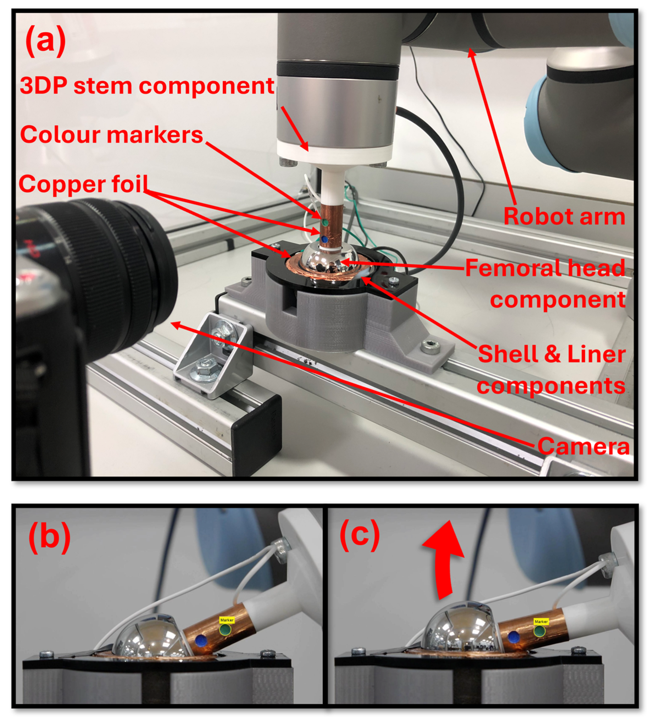 23]. An impingement-driven subluxation event was recreated using the robot arm to rotate the stem to an extreme angle beyond the normal working range of motion of the components, thus causing the components to impinge and the femoral head to lever out of the liner. A camera tracking system (CTS) consisting of a digital camera (Panasonic Lumix DMC-GF6K Panasonic, Osaka, Japan) and the Matlab (Matlab R2023a, Mathworks, Natick, MA, USA) Image Processing and Computer Vision toolbox was used to track the location of two colour markers that were positioned on the stem component. The position of the markers was then used to infer the location of the centre of the femoral head during the impingement-driven subluxation motion.