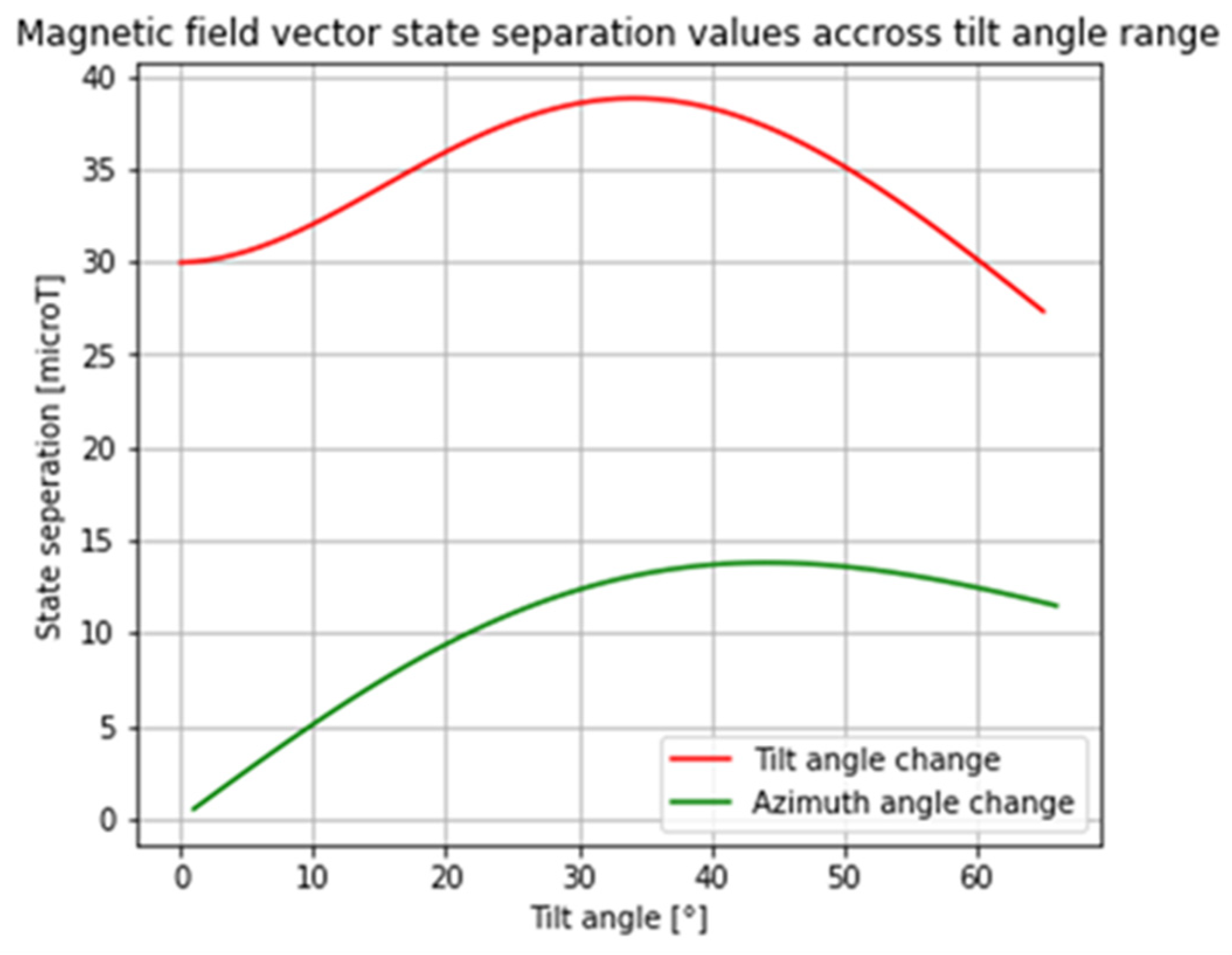 A plot of the magnetic field vector state separation values when tilt angle increases by 1°, starting at 0° for the 8 × 2 mm disc magnet configuration, is shown in