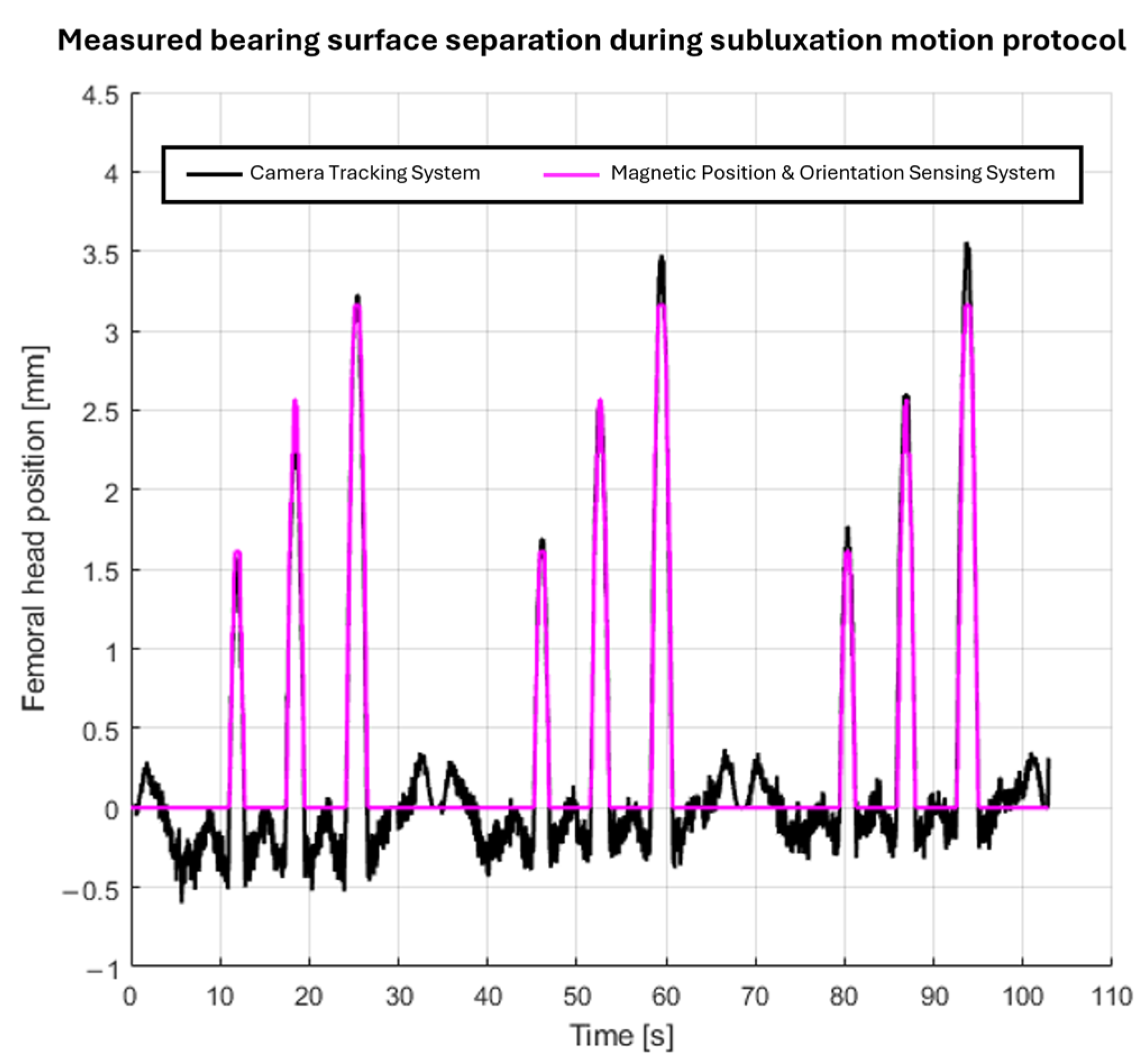 This novel magnetic position and orientation sensing system was able to measure the relative motions between the components and so derive the femoral stem’s neck orientation to two DoF and THR bearing surface separation during impingement-driven subluxation. The sensing system uses small form factor components and does not require contact with or alteration to the functional bearing surfaces.