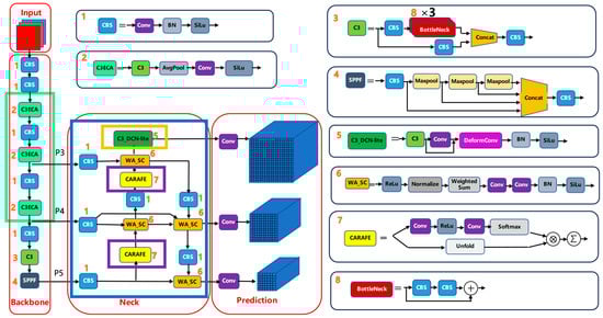 Figure 1. Overall architecture of the proposed ECA–DCN-lite–BiFPN–CARAFE-enhanced YOLOv5 model. Colored boxes highlight the newly added modules: green—ECA blocks in the C3 backbone stages; orange—the DCN-lite block on the P3 (stride-8) path; blue—BiFPN fusion nodes using the WA_SC block; purple—CARAFE upsampling operators in the top-down paths. Numbers shown next to the blocks are only reference indices without additional technical meaning.