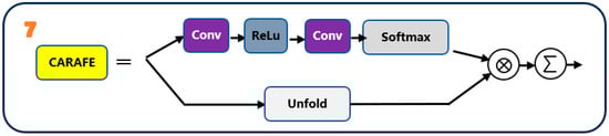 Figure 3. CARAFE content-aware upsampling in the neck. A content encoder compresses local neighborhoods, a kernel predictor generates position-specific reassembly kernels, and the reassembly operator uses these kernels to upsample the feature map. The number ‘7’ indicates the CARAFE upsampling module.