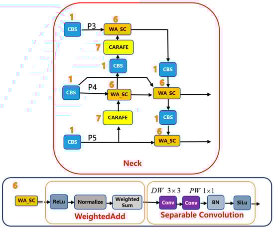 Figure 4. BiFPN-style multi-scale fusion with the WA_SC node. Each fusion node takes several input features at different resolutions, normalizes learnable fusion weights across inputs, forms a weighted sum, and refines the result with a depthwise separable convolution. The number ‘6’ indicates the WA_SC module.