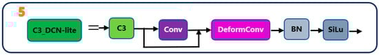 Figure 5. DCN-lite module on the P3 (stride-8) feature map. A small convolution predicts offsets for a 3 × 3 sampling grid, and the shifted grid is used to perform deformable convolution on P3, enhancing geometric flexibility for small defects. The number ‘5’ indicates the C3_DCN-lite module.