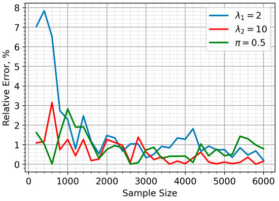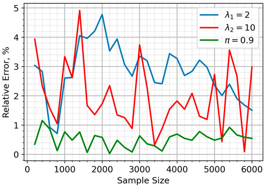In Figure 1, it is assumed that the sensors have an equal probability of being in either the clean or polluted air zones (). The relative error of the parameter estimates, for the situation in which 90% of sensors are within the air pollution zone (), is illustrated in Figure 2. The proposed approach yielded a highly accurate and stable estimate for the λ2 parameter, corresponding to sensor data from the pollution zone. While the accuracy of the λ1 estimate decreased compared to the equal sample size scenario, this only impacted a minor portion of the sample (10%). Figure 3 depicts the case where the majority of sensors (90%) are in unpolluted zones (). As expected, the parameter estimates show noticeable fluctuations in accuracy, though these consistently stay within a 5% margin.