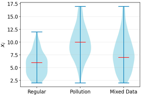 Let us consider an extreme scenario with a modest sample size (N = 200) and relatively close detection intensities (). The dataset generated for this situation is presented in Figure 4 as a violin plot. This violin plot illustrates the smoothed density of data distribution, where its width shows the frequency of values, and the inner red line indicates the median. The result of EM clustering for is shown in Figure 5. A shift in improves the estimation accuracy for the predominant subsample.