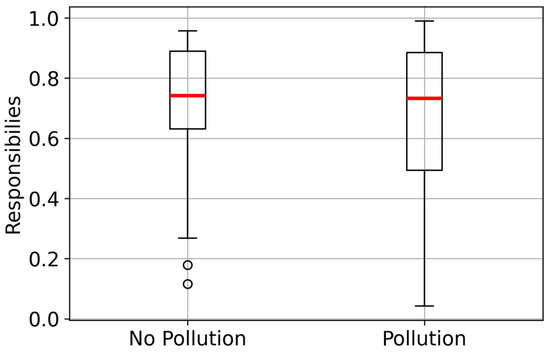 In this scenario, unlike hard clustering approaches (e.g., k-means), which would disable over 30% of sensors in the pollution zone, probabilistic clustering enables the involvement of all these sensors in intensive and detailed air pollution monitoring via parameterized data transmission policies. Even a simple activation policy, triggering intensive operation or a switch to energy-saving mode when a sensor’s probability exceeds a 0.5 threshold, ensures that a significant majority of sensors are correctly assigned an operational state commensurate with their true status. Dynamic resource management based on responsibility information ensures almost full activation of sensors in hazardous regions at the expense of temporary acceptance of additional short-term costs. Conversely, the same framework allows for a substantial reduction in monitoring intensity and data transmission volume within safe zones. This adaptive strategy ensures that limited resources are allocated to activities of the highest operational relevance. Although this may result in lower-resolution monitoring in non-critical areas, it substantially enhances overall cost-effectiveness. Moreover, it addresses an inherent flaw of hard clustering, where the misclassification of a subset of sensors can create critical blind spots that lead to the loss of essential data from contaminated regions and consequently to high economic and societal costs.
