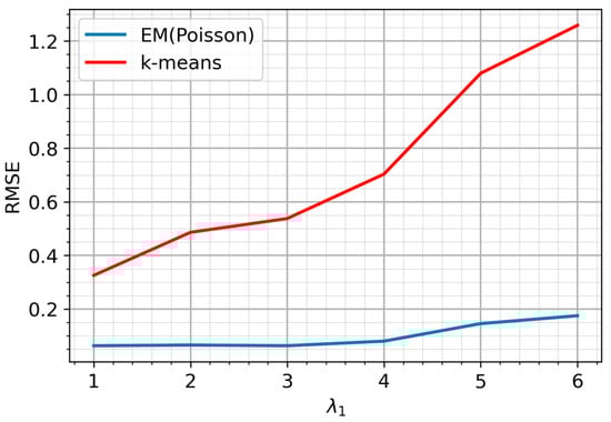 Next, we compare the estimates derived from the proposed EM algorithm with those obtained through k-means clustering using Root Mean Square Error (RMSE). Although the parameters of the Poisson mixture ( and ) and k-means centroids are fundamentally different in nature, representing probabilistic parameters and geometric centers, respectively, this comparison is methodologically justified in the context of this paper. Since the data are generated from a known Poisson mixture, the k-means centroids can be interpreted as empirical estimates of the distribution means. Thus, evaluating both methods via RMSE provides meaningful insight into their relative effectiveness at recovering the true data-generating parameters. Figure 6 presents the results of performance comparison with a fixed and a varying .