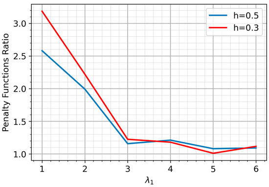 Under an equal mixing coefficient (, which represents an ideal scenario for k-means, the performance was evaluated by calculating the ratio of the k-means penalty value to that of the EM algorithm. The optimal threshold is inversely related to the penalty weight . We select a boundary value of to analyze the transition where both error types are equally penalized, and . Figure 7 presents the results of this comparison.