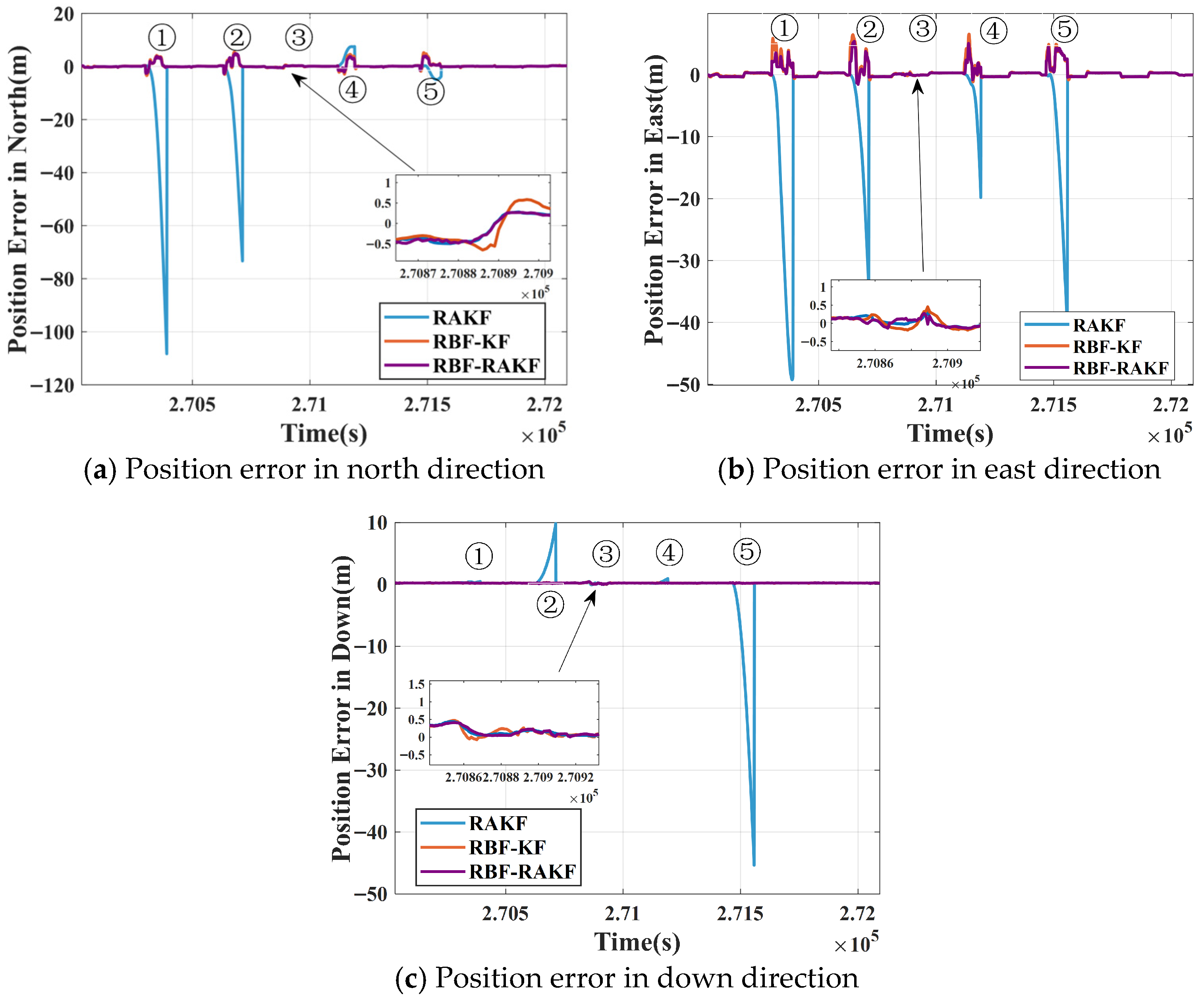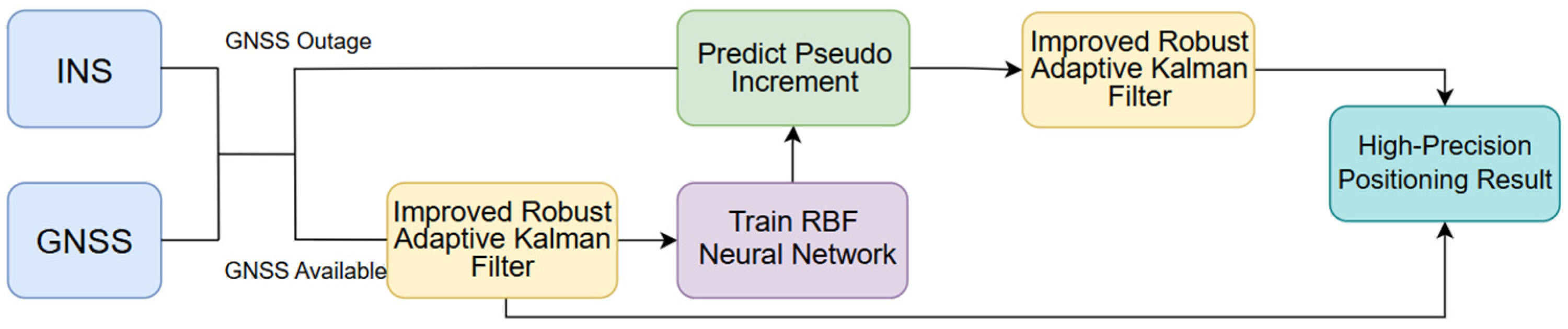 - The pseudo-measurements predicted by the RBF neural network are incorporated into the improved Robust Adaptive Kalman Filter. The final GNSS/INS-integrated navigation positioning result is thus obtained.
