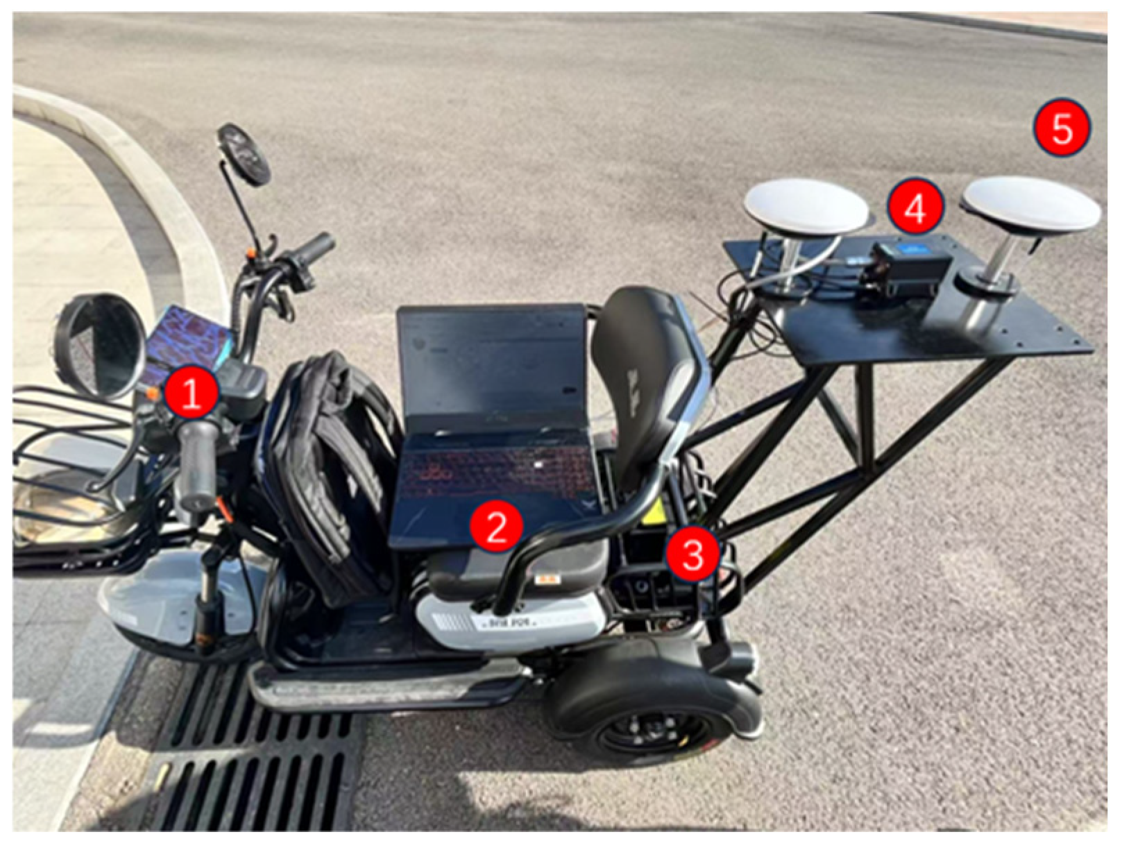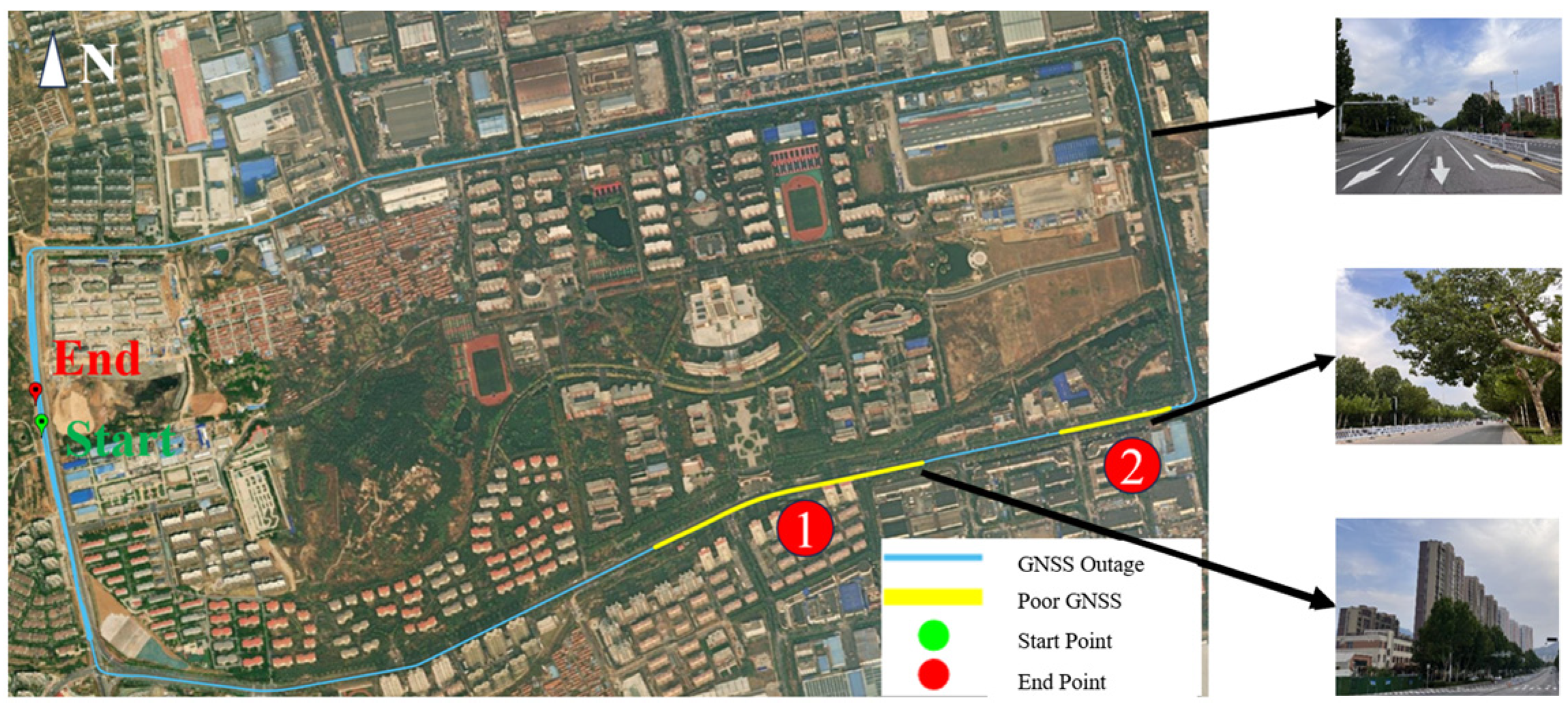 - Feng, X.; Qiu, M.; Wang, T.; Yao, X.; Cong, H.; Zhang, Y. Noise-Adaptive GNSS/INS Fusion Positioning for Autonomous Driving in Complex Environments. Vehicles 2025, 7, 77. [Google Scholar] [CrossRef]