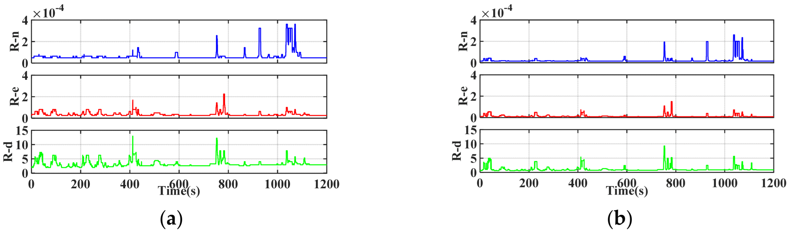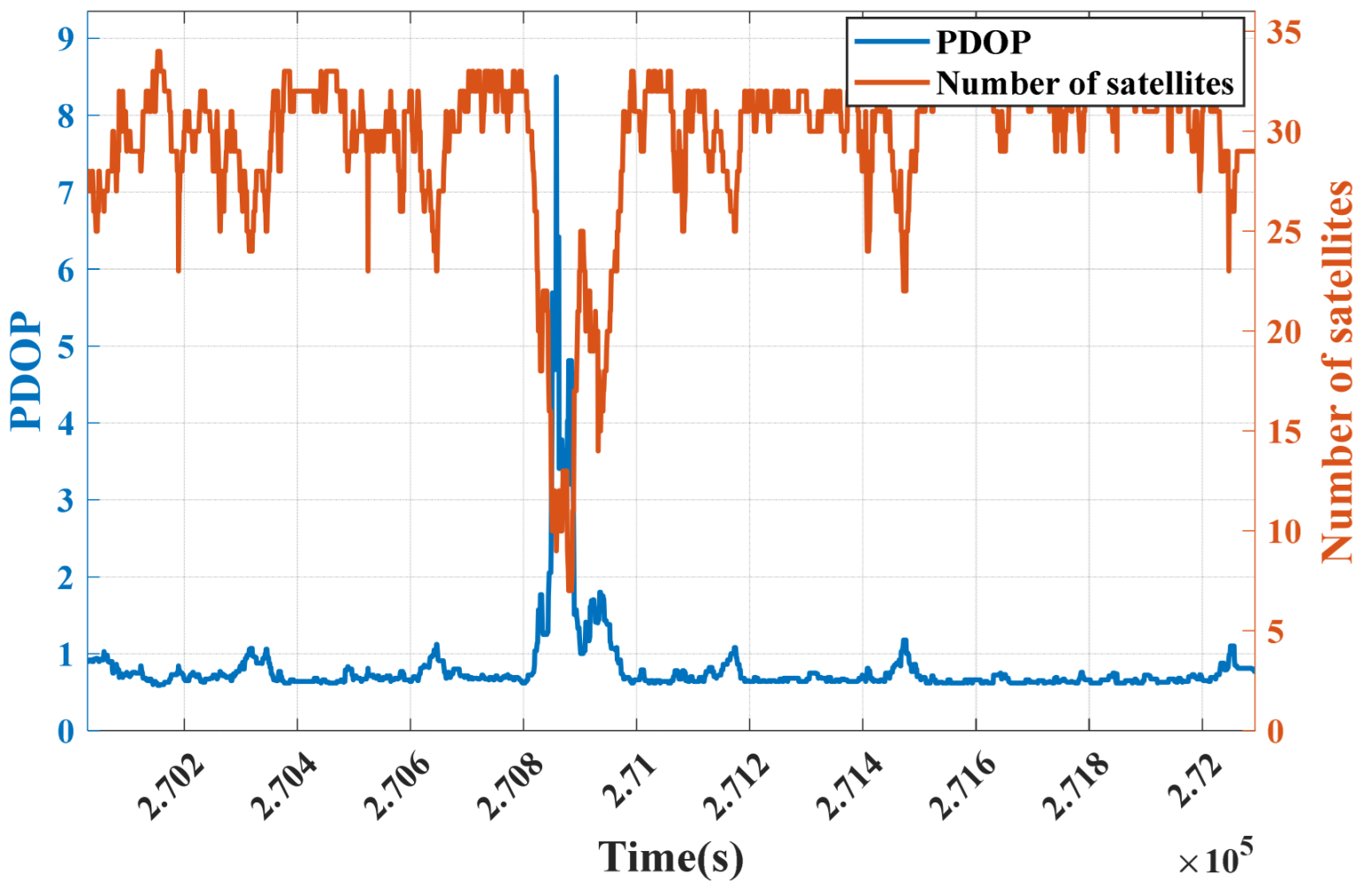 - The enhanced RAKF dynamically adjusts the measurement noise covariance matrix based on parameters like PDOP and the number of satellites. This reduces the weight of abnormal observations during GNSS signal fluctuations, effectively preventing filter divergence.