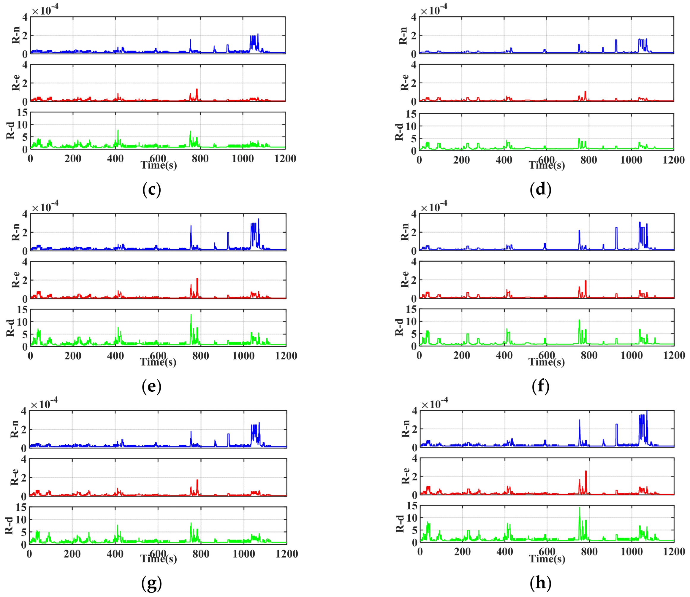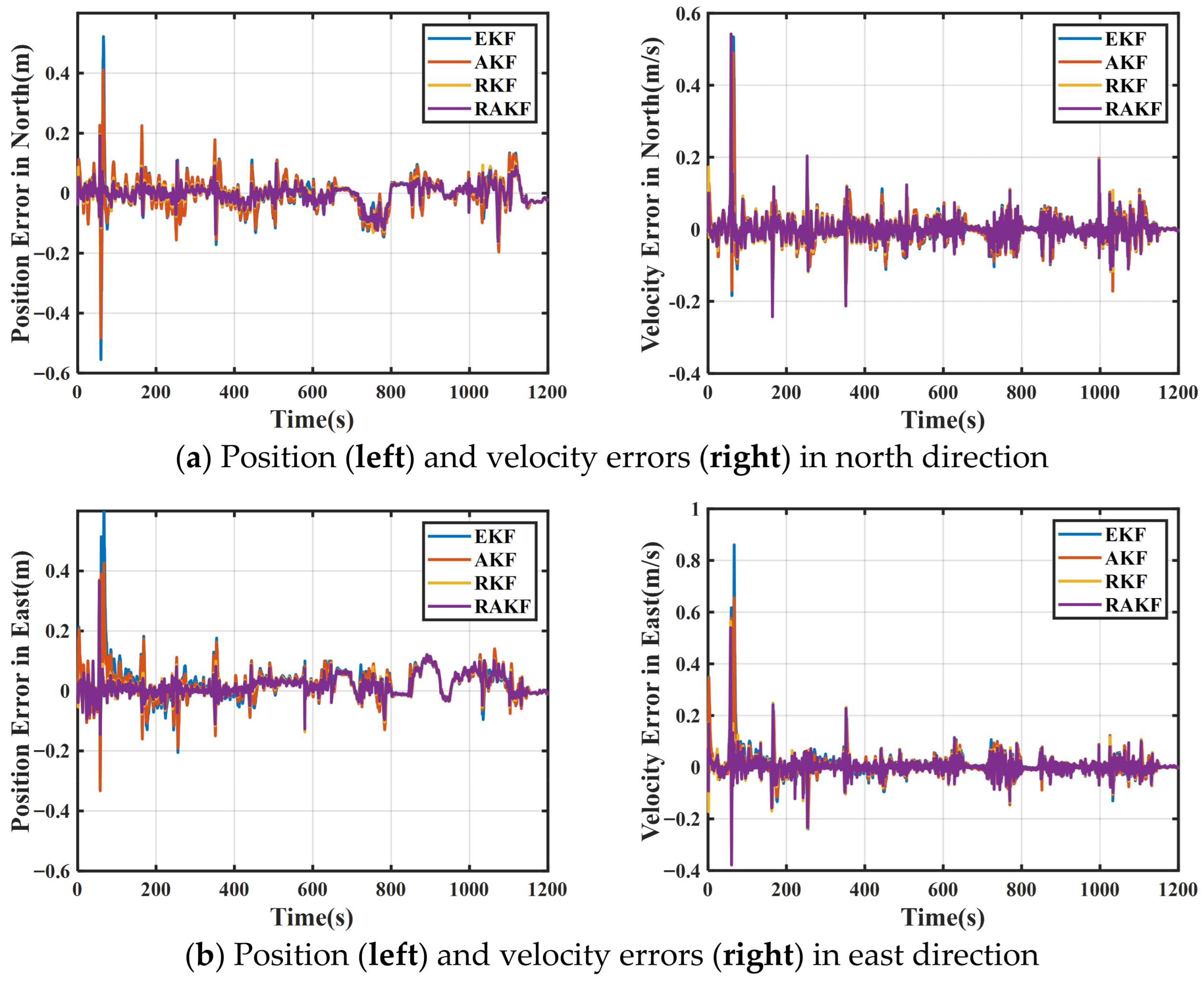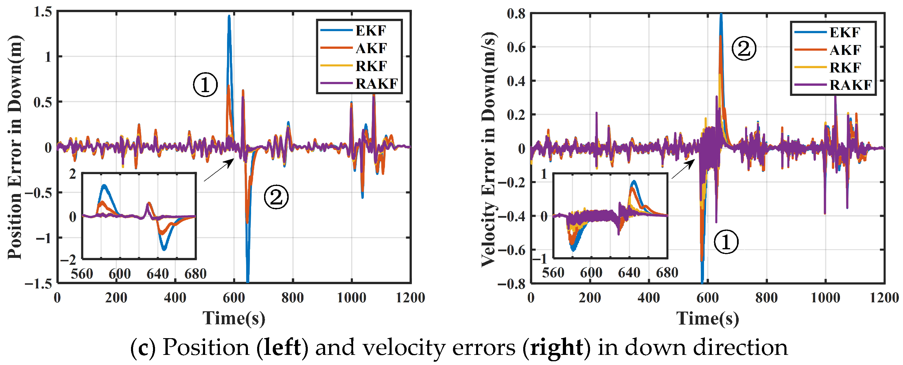- Wang, Q.; Liu, J.; Jiang, J.; Pang, X.; Ge, Z. Application of Improved Fault Detection and Robust Adaptive Algorithm in GNSS/INS Integrated Navigation. Remote Sens. 2025, 17, 804. [Google Scholar] [CrossRef]