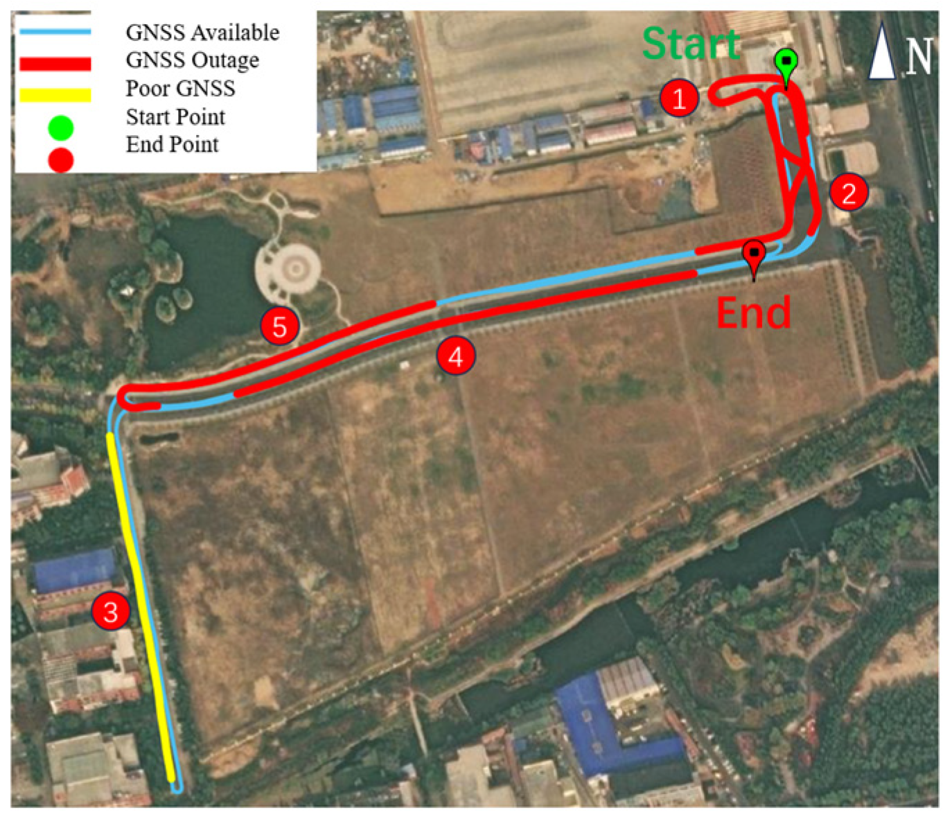 - Xu, Y.; Wang, K.; Yang, C.; Li, Z.; Zhou, F.; Liu, D. GNSS/INS/OD/NHC Adaptive Integrated Navigation Method Considering the Vehicle Motion State. IEEE Sens. J. 2023, 23, 13511–13523. [Google Scholar] [CrossRef]