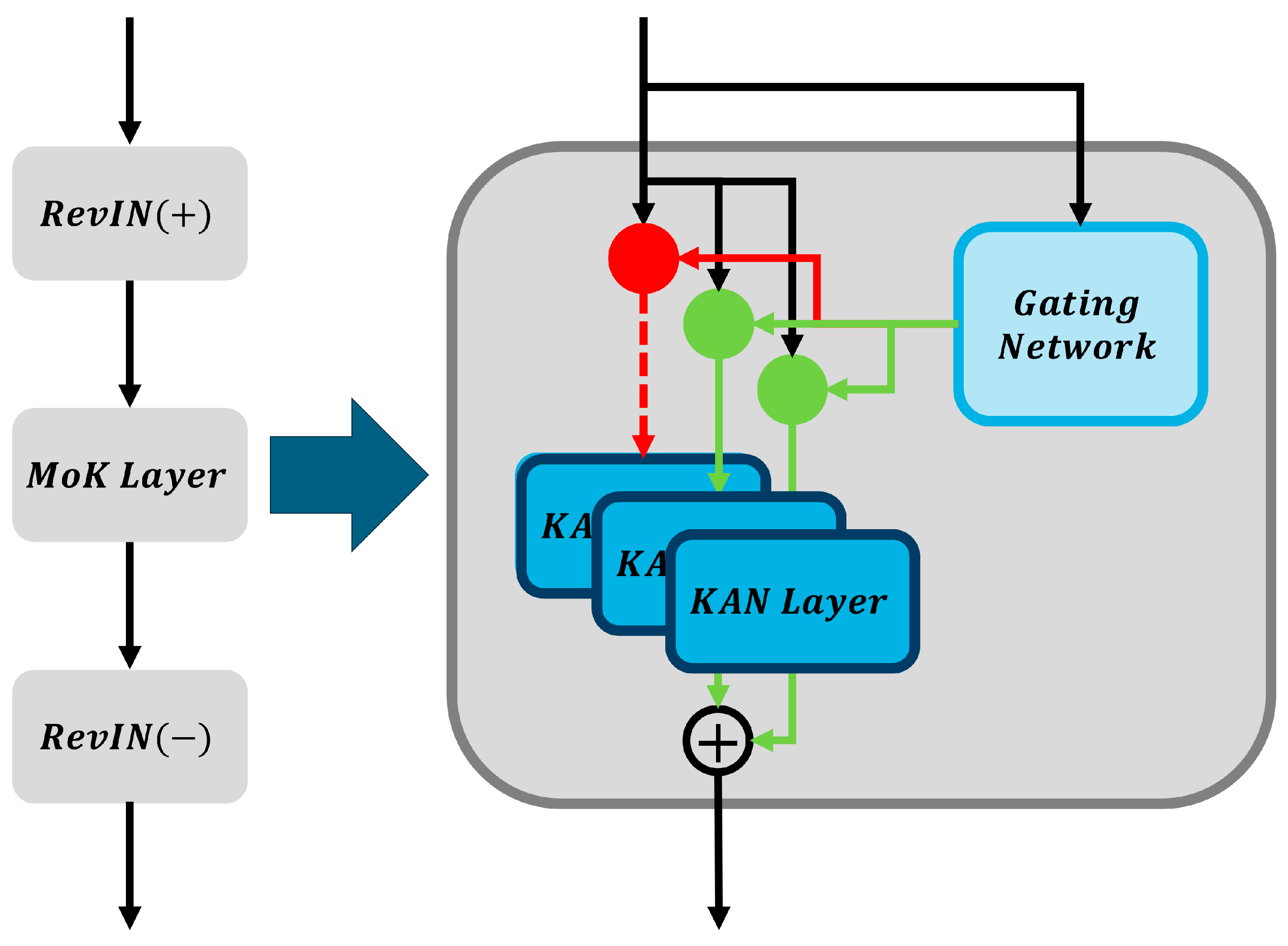 A recent model in the KAN family, namely reversible mixture of KAN experts (RMoK) [39], was designed to maximize the forecasting performance with only a single KAN layer while preserving the interpretability of the model. RMoK first employs a RevIN step to mitigate nonstationarity in the input time series. Specifically, for each variable in the input window, RMoK normalizes the data by subtracting the mean and dividing by the standard deviation of that window; it, then, records these statistics. After this normalization, core forecasting is performed using a structure called a mixture of KAN experts (MoK) layer. The MoK layer consists of multiple KAN-based expert networks in parallel, along with a gating network that determines how to weigh the output of each expert based on the characteristics of the input. Each KAN expert can use different basis functions or forms, allowing them to specialize in modeling certain types of patterns or distributions in data. The gating network takes the input (or its representation) and assigns a weight to each expert output, effectively selecting and blending the most suitable experts in a given input window. The outputs of the experts are combined (weighted sum) to produce a normalized forecast. Finally, RMoK applies the stored mean and standard deviation in an inverse normalization step, converting the forecast to the original scale and distribution of the data. Despite having only this single RevIN + MoK layered structure, RMoK achieves state-of-the-art forecasting accuracy on a variety of benchmark datasets, demonstrating its practical effectiveness.