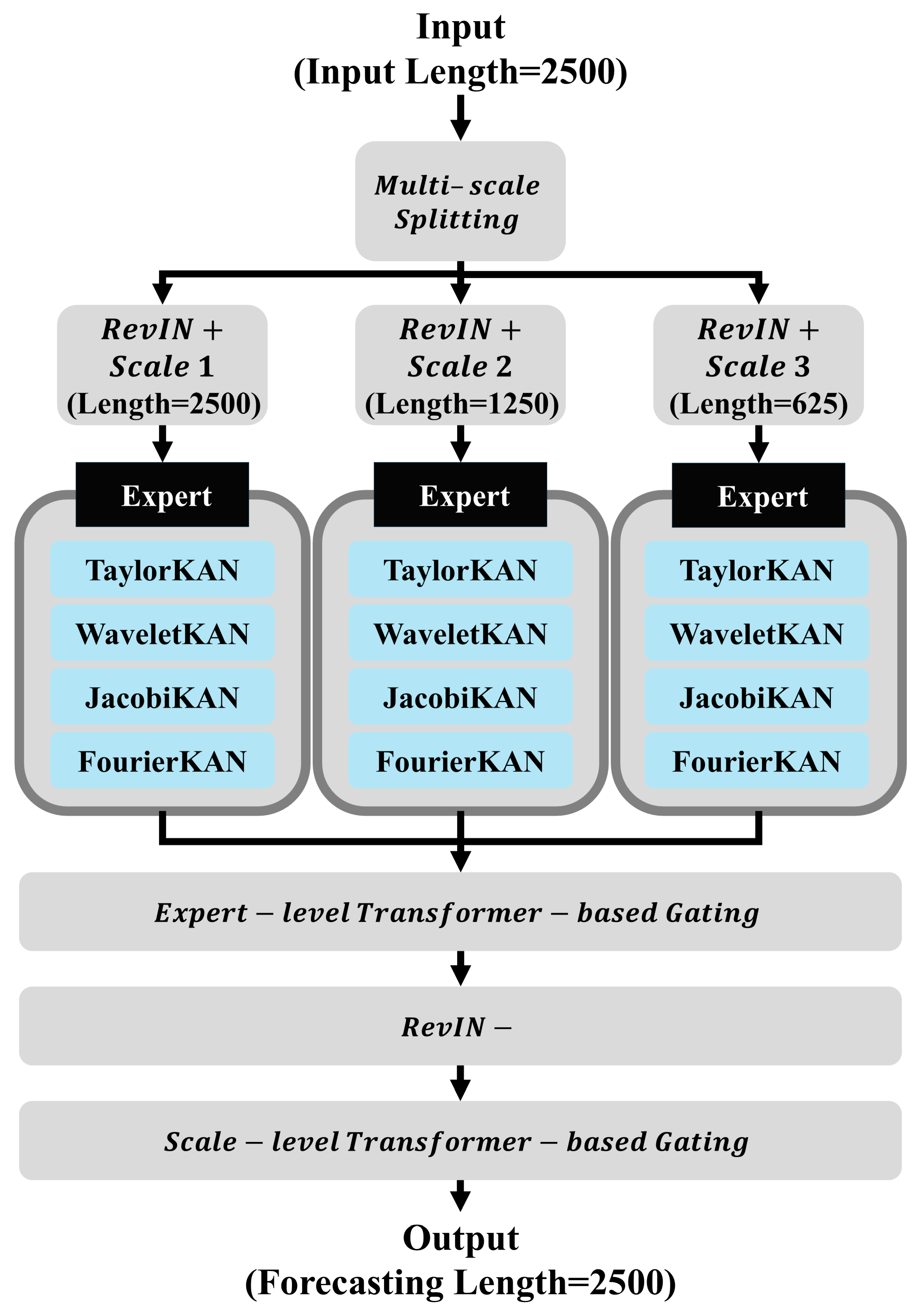 Kim D, Kang J, Hwang H, Kim H. MoEKAN: Multi-Scale Transformer-Based Gating KAN Experts Network for Time Series Forecasting. Sensors. 2025; 25(23):7287. https://doi.org/10.3390/s25237287