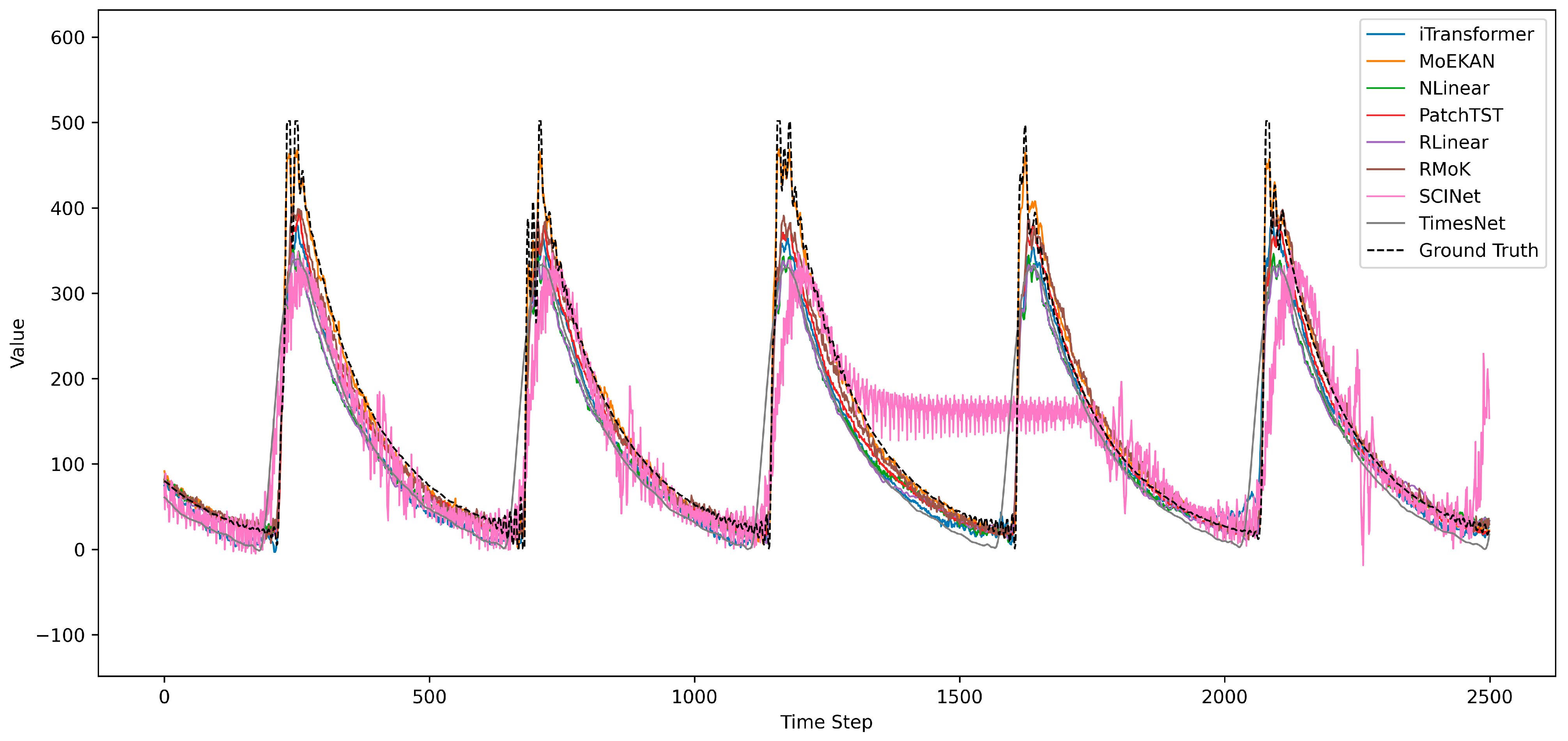 Figure 5. Comparison of total forecasting results between existing networks and MoEKAN.