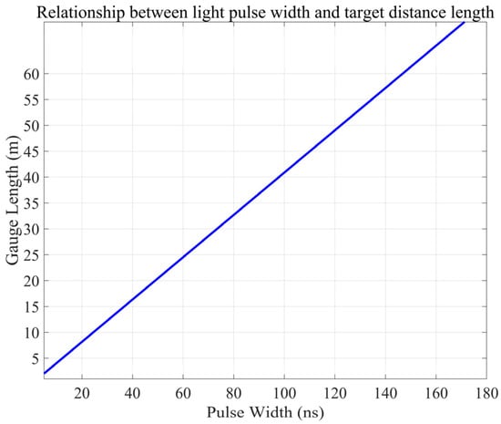 Figure 2 demonstrates the approximately linear comparison of the optical pulse width τ and gauge length L in a DAS system. As τ varies from 0 to 200 ns, L runs from 0 to ~80 m using an estimated L ≈ 0.40 τ. When τ is too short, far-end Rayleigh backscattering cannot temporally overlap with near-end scattering, and interference signal intensity is greatly reduced rapidly, with measurement accuracy declining rapidly with increasing range. Alternatively, excessively long pulses add more background noise and can lead to overlapping multiple scattering, both of which contribute to lowering signal-to-noise ratio while also increasing system complexity and error sources, sometimes making signal interpretation difficult. Moreover, in complex geological or high-strain environments, incomplete fiber–medium coupling and variations in the scattering coefficient can produce local deviations from this linear trend.