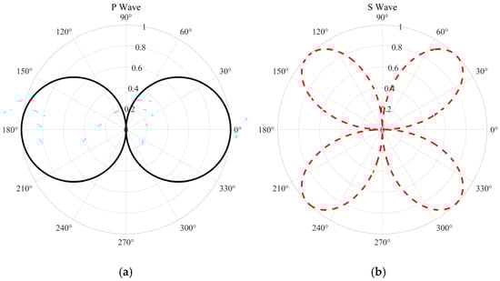 By substituting the SV wave’s axial velocity component and the axial wavenumber kz, and using the shear wave velocity β, then applying algebraic simplification and trigonometric identities, one obtains the analytical expression for axial strain (Equation (18)). As shown in Figure 3b, the wave’s directional response is governed by the sin(2δ) term.