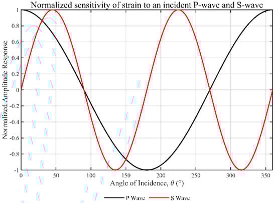 As shown in Figure 4, based on the preceding analysis, we establish a theoretical model for the normalized amplitude response of a straight-laid fiber sensor to the P-wave and S-wave as a function of incidence angle θ. In this model, θ equals zero degrees when the wave propagates parallel to the fiber axis. The P-wave, represented by the black curve, exhibits a dipole behavior as cosθ, with maxima at 0° and 180°, and zeros at 90° and 270°, indicating that it is not tolerant to normal incidence. The red response curve of the S-wave exhibits a quadrupole sin2θ pattern, with zeros at 0°, 90°, 180°, and 270°, and peaks at 45°, 135°, 225°, and 315°, resulting from the increase in axial deformation caused by the obliquely incident shear waves. This anisotropic behavior simultaneously showcases the blind edges characteristic of a fiber, while also providing a platform for distributed acoustic sensing to discriminate P-wave responses from S-wave responses, intercept the direction and polarization of seismic wave incidence, and to more effectively observe the complex wavefields on a multi-directional or helical cable.