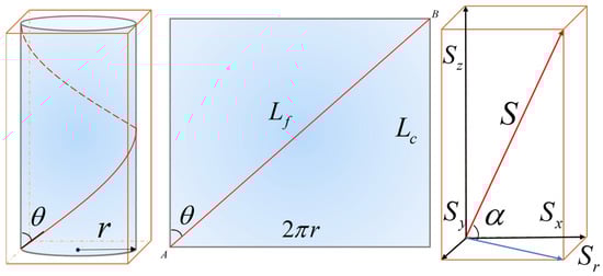 To more accurately describe the geometry of helically wound optical fiber, a geometric model of the fiber winding on the cable core within one pitch is established, as illustrated in Figure 6. In this model, points A and B represent the start and end points of one complete winding pitch of the fiber on the cable core. The parameter r denotes the radius of the cable core. The length of the cable from point A to point B is the pitch length, while Lf represents the actual length of the fiber between points A and B.