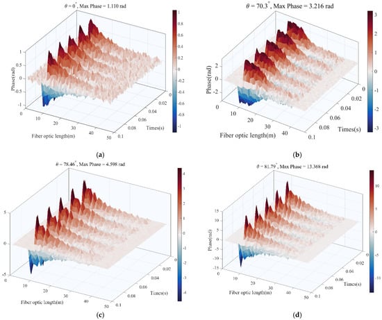 In this equation, n represents the refractive index of the fiber, k = 2π/λ is the wave number, and λ is the average wavelength of the laser in a vacuum within the system. The parameter L denotes the length of the fiber under perturbation, while ε represents the axial strain of the fiber. The term v is Poisson’s ratio, and P11 and P12 are the photoelastic coefficients of the fiber. As the helical winding angle θ increases, the cosine of θ decreases, resulting in a longer effective length Lf. The increase in winding angle θ creates a longer fiber path, which enhances interaction with acoustic waves and consequently improves signal strength.