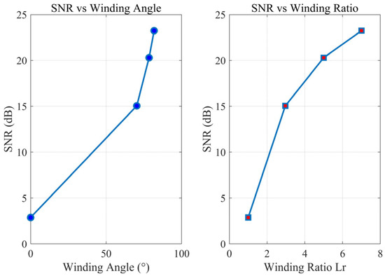 Analyzing from the perspective of sensing distance, a higher winding ratio results in a later drop in SNR relative to the noise baseline; therefore, Lr = 8 has the longest detectable distance. When comparing the SNR at four vibration frequencies with a fixed winding ratio, the Lr = 8 fiber-optic cable at 30 Hz has the highest SNR across all charts. Correspondingly, the Lr = 8 fiber-optic cable performs the worst at 40 Hz. A possible reason for this is that, as the frequency of the vibration source increases, the coupling curve between the fiber-optic cable and the soil decreases, leading to a simultaneous increase in both signal and noise, but a corresponding decrease in the improvement in the SNR. This again demonstrates that a high winding ratio is the key factor in improving SNR, providing the basic gain. At the same time, low frequencies represent the optimal frequency matching range for maximizing this gain.
