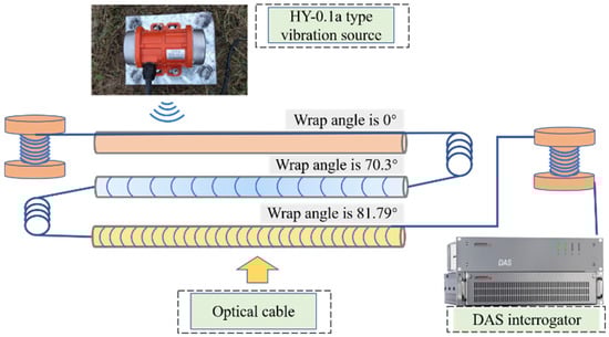When buried optical fibers are used for seismic wave sensing, the fiber winding angle has a significant impact on the sensitivity of the DAS system. Spiral-wound cables, although having slightly lower maximum sensitivity than straight cables, provide a more balanced response to seismic waves from all directions []. Increasing the total length of spiral-wound fibers within the cable, as well as the winding density, can enhance sensitivity to environmental vibrations []. Al Hasani [] has already reported that the fiber spiral winding angle can maximize the signal-to-noise ratio of such reflected waves, an improvement that remains to be found with tailored designs and manufacturability, as well as mechanical reliability.